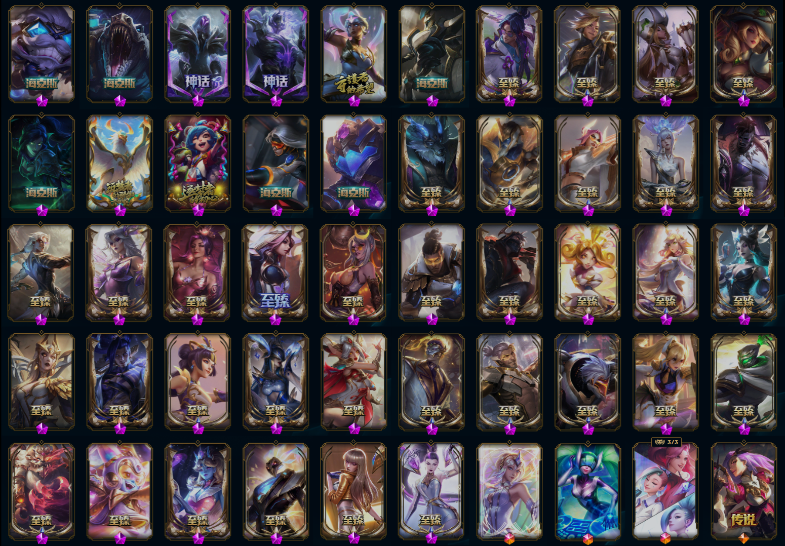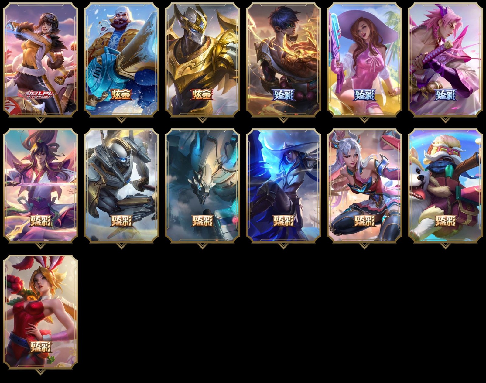 【重要皮肤】墨之影武者亚索至臻 花仙使者卡特琳娜至臻 绝息圣堂厄运小姐至臻 剪纸仙灵希维尔至臻 青花瓷丽桑卓至臻 北极星使者沃里克至臻 太空律动魔音海妖娜美至臻 至高天奎桑提至臻 灵魂莲华易至臻 海珀利安小队X09星环灵风迦娜至臻 星之守护者辛德拉至臻 西部魔影猎天使恶魔泰隆至臻 青花瓷拉克丝至臻 神凰行者烈羽焰凰霞至臻 魅惑女巫莫甘娜至臻 战斗学院蕾欧娜至臻 太空律动璐璐至臻 魔女乐芙兰至臻 未来战士卢锡安至臻 星之守护者索拉卡至臻 灵能特工伊泽瑞尔至臻 福牛守护者菲奥娜至臻 源计划逆流塞拉斯至臻 源计划阴劫至臻 黑夜使者凯隐至臻 神龙尊者均衡之龙沃利贝尔至臻 征服者贾克斯至臻 飞升战神潘森至臻 焰执事布兰德至臻 KDA二代卡莎至臻 KDA一代卡莎至臻 KDA卡莎2022至臻 烈焰美人薇恩至臻 烈焰美人薇恩2022至臻 魅惑女巫厄运小姐至臻 星之守护者妮蔻至臻 未来战士锤石至臻 未来战士锤石2022至臻 灰烬守护者慎 灰烬骑士派克 海克斯科技安妮 海克斯科技雷克顿 海克斯科技吉格斯 海克斯科技拉莫斯 永恒之森奥恩 暗星科加斯 黎明使者卡尔玛 零之枪骑赫卡里姆 摄魂使者薇恩 新创战纪希维尔 胜利女神娑娜 胜利女神希维尔 胜利巨口克格莫 荣誉使者玛尔扎哈 勇敢的心德莱厄斯 电玩勇者锐雯 玉剑传说无影 玉剑传说舞剑仙 神凰行者幽羽玄凰萨勒芬妮 神凰行者烈羽焰凰霞 海珀利安小队Y03权天使卡蜜尔 星之守护者佐伊 龙的传人李青 剪纸仙灵艾瑞莉娅 剪纸仙灵希维尔 剪纸仙灵盖伦 剪纸仙灵婕拉 剪纸仙灵加里奥 招财进宝提莫 替父从军花木兰 神龙烈焰金克丝 你看见过我的熊猫吗安妮 北辰之威内瑟斯 玉净夜叉凯特琳 紫金罗刹莫甘娜 广寒仙子嫦娥 神龙之翼库奇 王国机神朱雀蕾欧娜 王国机神玄武盖伦 福牛守护者安妮 福牛守护者德莱厄斯 福牛守护者阿利斯塔 福牛守护者嘉文四世 福牛守护者菲奥娜 胜利女神瑟庄妮 胜利之树茂凯 胜利机器人布里茨 胜利女神奥莉安娜 胜利枪神格雷福斯 胜利枪神卢锡安 胜利之剑亚托克斯 水晶玫瑰阿克尚 甜心之翎洛 觅心萝莉金克丝 觅心猫猫悠米 觅心猎手薇恩 幽梦玫瑰辛德拉 幽梦玫瑰泰隆 北极星神黛安娜 北极星猎人斯维因 北极星使者萨科 冬境仙灵索拉卡 圣诞老人布隆 圣诞老人德莱文 狂心冰王图奇 平安夜女神娑娜 圣诞糖果棒厄运小姐 魅惑女巫奈德丽 死亡誓约劫 灵魂收割者索拉卡 勇敢的心德莱厄斯 泳池派对凯特琳 泳池派对佐伊 泳池派对厄运小姐 泳池派对格雷福斯 泳池派对李青 泳池派对蕾欧娜 泳池派对雷克顿 电玩战魂赫卡里姆 制胜金靴李青 FPX李青 iG卡莎 SSG纳尔 SSG嘉文四世 SKTT1娜美 SKTT1奥拉夫 SKTT1瑞兹 SKTT1雷克顿 SSW锤石 SSW雷恩加尔 SSW泰隆 SSW图奇 SSW辛吉德 SKTT1贾克斯 SKTT1婕拉 SKTT1李青 SKTT1薇恩 暗杀星努努和威朗普 暗杀星慎 Fnatic迦娜 Fnatic古拉加斯 Fnatic嘉文四世 Fnatic卡尔萨斯 冰雪节格雷福斯 冰雪节辛吉德 防暴士兵辛吉德 防暴天使凯尔 钢铁之翼艾尼维亚 冠军典狱长锤石 冠军之刃锐雯 冠军之刃锐雯2016 冠军之血希瓦娜 冠军之隐劫 春晖大帝锤石 鬼影森森茂凯 鬼影重重魔腾 红桃杰克崔斯特 警用试作体K9内瑟斯 密林猎手提莫 南瓜头费德提克 圣诞精灵崔丝塔娜 圣诞开心鬼提莫 圣诞老人古拉加斯 圣诞驯鹿克格莫 无头骑士赫卡里姆 喜庆之树茂凯 邪恶圣诞老人维迦 野兽猎人瑟庄妮 英勇玩具兵普朗克 勇者奈德丽 征服者卡尔玛 征服者韦鲁斯 暗影沃里克 2022全球总决赛阿兹尔 波比的巧克力工坊 都铎王朝图奇 十周年纪念安妮 源代码乐芙兰 神凰行者瑞羽圣凰艾尼维亚 胜利凤凰艾尼维亚 DJ娑娜 大元素使拉克丝 灵魂守卫乌迪尔 未来战士伊泽瑞尔 武装战姬厄运小姐 KDAALLOUT萨勒芬妮独立音乐人 KDAALLOUT萨勒芬妮明日新星 KDAALLOUT萨勒芬妮超级巨星 绝息圣堂洛