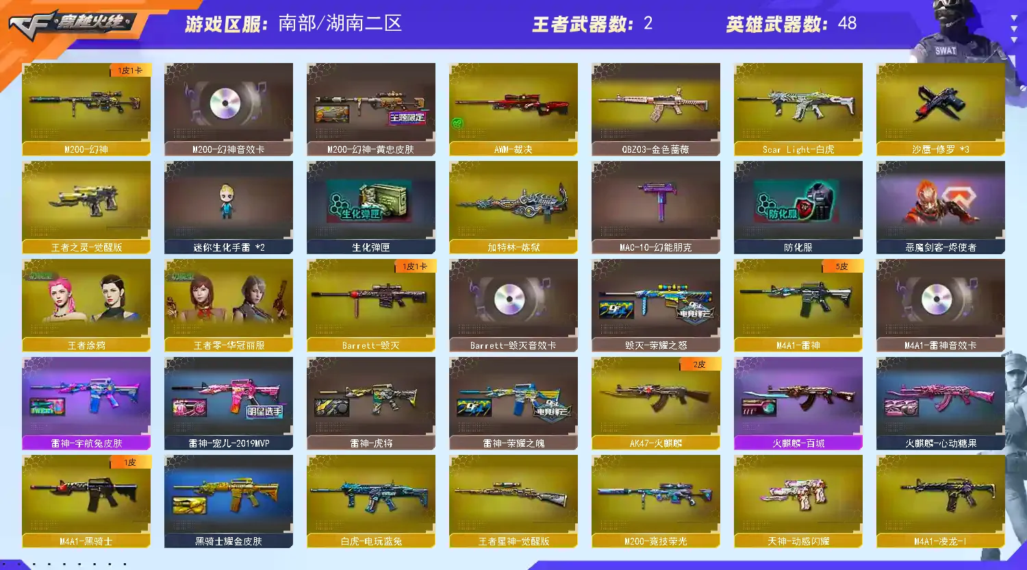 湖南二区有二次可排位63v【m200-幻神+幻神-黄忠+m200-幻神音效卡】【王者星神】【m200-竞技荣光】【qbz03-金色蔷薇】【scarlight-白虎+白虎-电玩蓝兔】【雷神+雷神-宠儿+雷神-荣耀之魄+雷神-虎将+雷神-宇航兔+雷神音效卡】【火麒麟+火麒麟-百城+火麒麟-ag+火麒麟-雷神+火麒麟-cfstar】【黑骑士+黑骑士-耀金】【天启+无影+朱雀+超新星-热带奇洋+烈火-动感闪耀】【barrett-毁灭+毁灭-荣耀之怒+毁灭-秦师+毁灭音效卡】【amw-裁决+awm-天龙】盘龙炼狱修罗天神-动感闪耀王者之灵屠龙麒麟刺擎天-竞技荣光屠龙-动感闪耀云龙扇龙啸-热带奇洋龙啸-烈火龙威【角色】王者涂鸦乔伊教练王者零-华冠丽服等一系列武器加道具