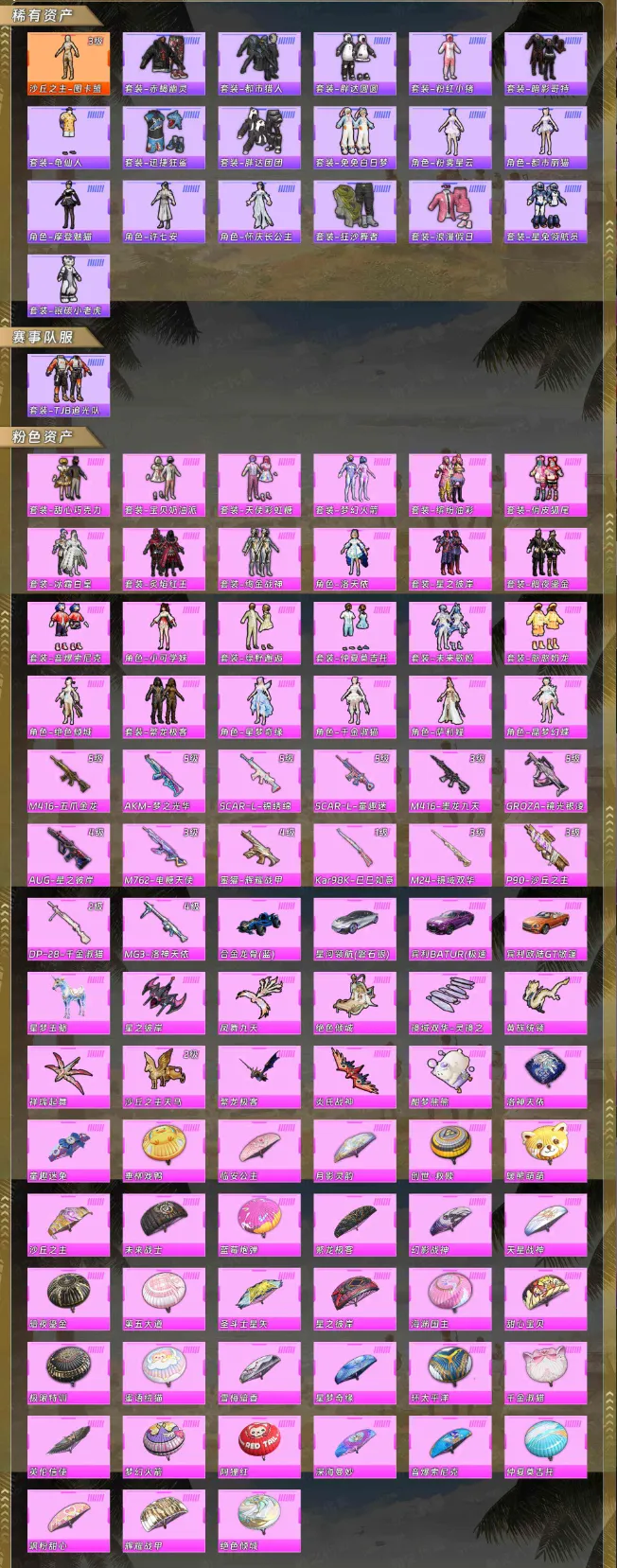 【稀有资产】沙丘之主-图卡盟[3级]/套装-赤蝎幽灵/套装-都市猎人/套装-胖达圆圆/套装-粉红小猪/套装-暗影哥特/套装-龟仙人/套装-迅捷狂鲨/套装-胖达团团/套装-兔兔白日梦/角色-粉雾星云/角色-都市丽猫/角色-摩登魅猫/角色-许七安/角色-怀庆长公主/套装-狂沙舞者/套装-浪漫假日/套装-星兔领航员/套装-银碳小老虎