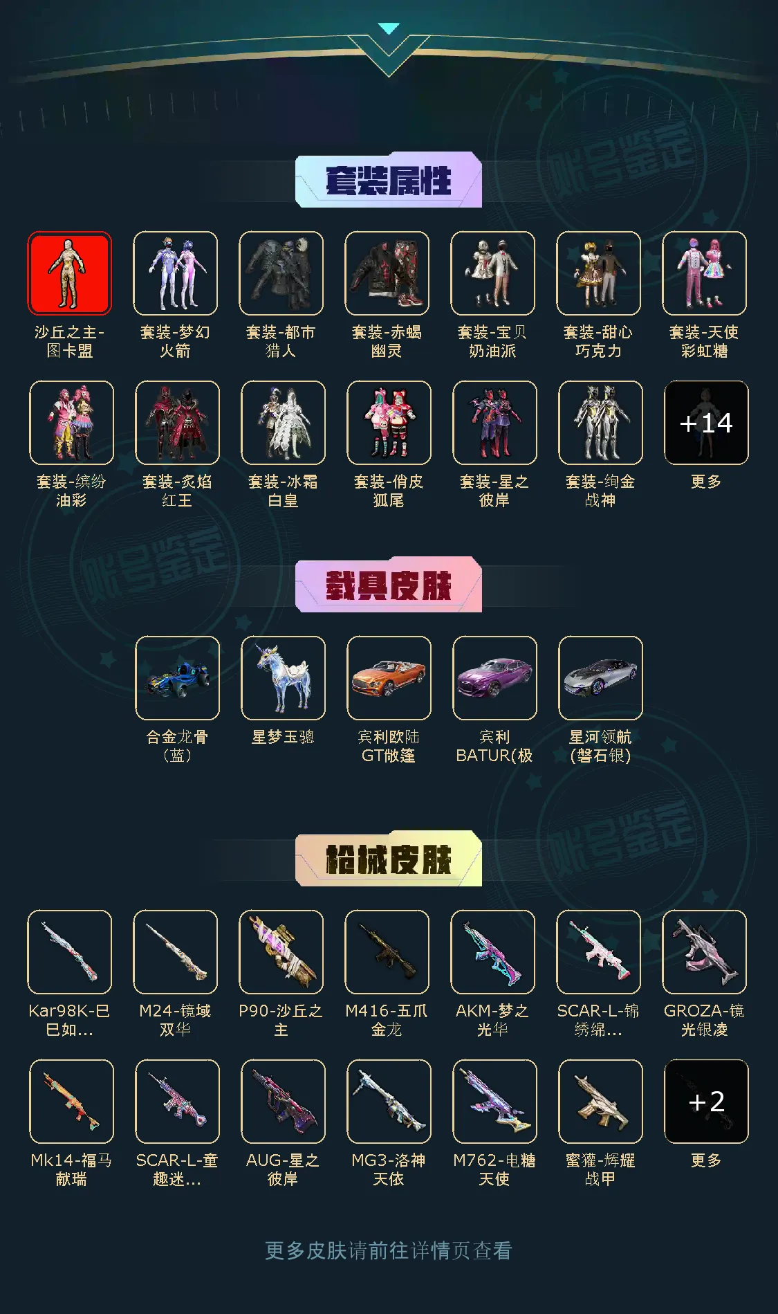 【粉色枪皮】M416-五爪金龙/AKM-梦之光华/SCAR-L-锦绣绵绵/SCAR-L-童趣迷兔/M416-墨龙九天/GROZA-镜光银凌/AUG-星之彼岸/M762-电糖天使/蜜獾-辉耀战甲/Kar98K-巳巳如意/M24-镜域双华/P90-沙丘之主/DP-28-千金淑猫/MG3-洛神天依
