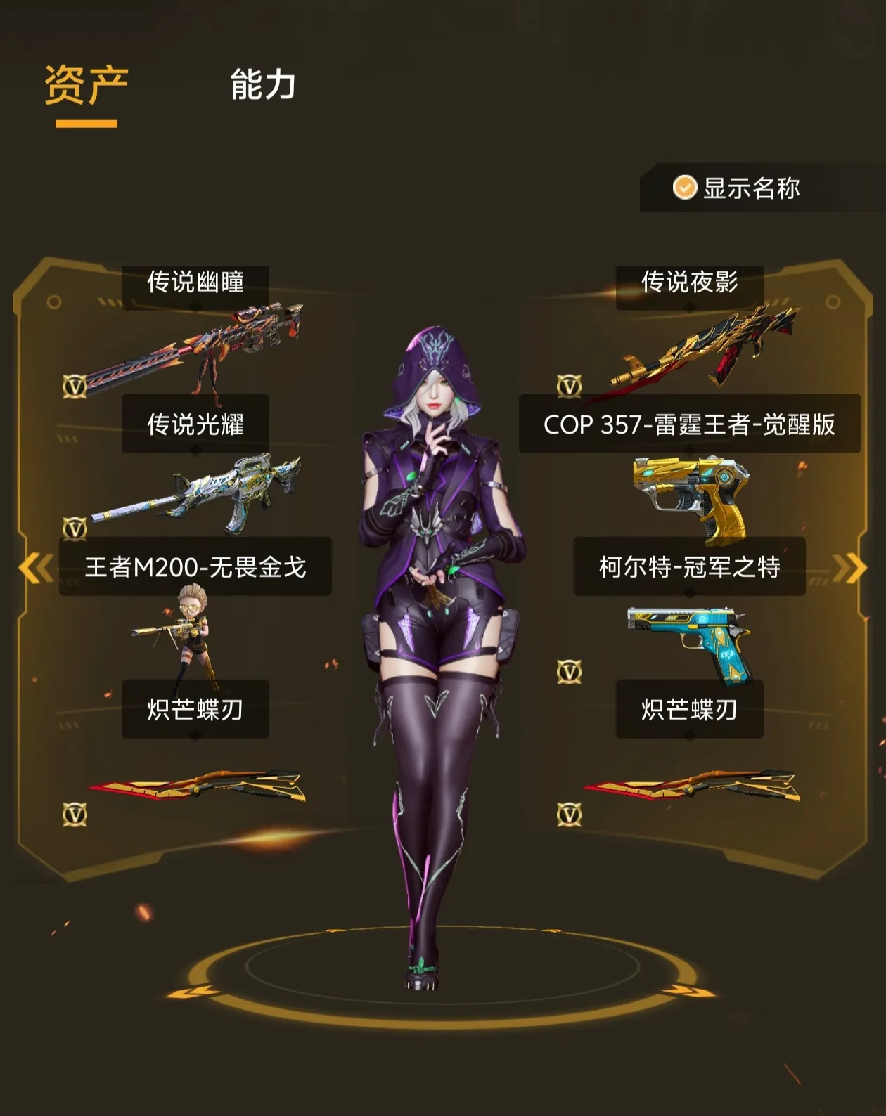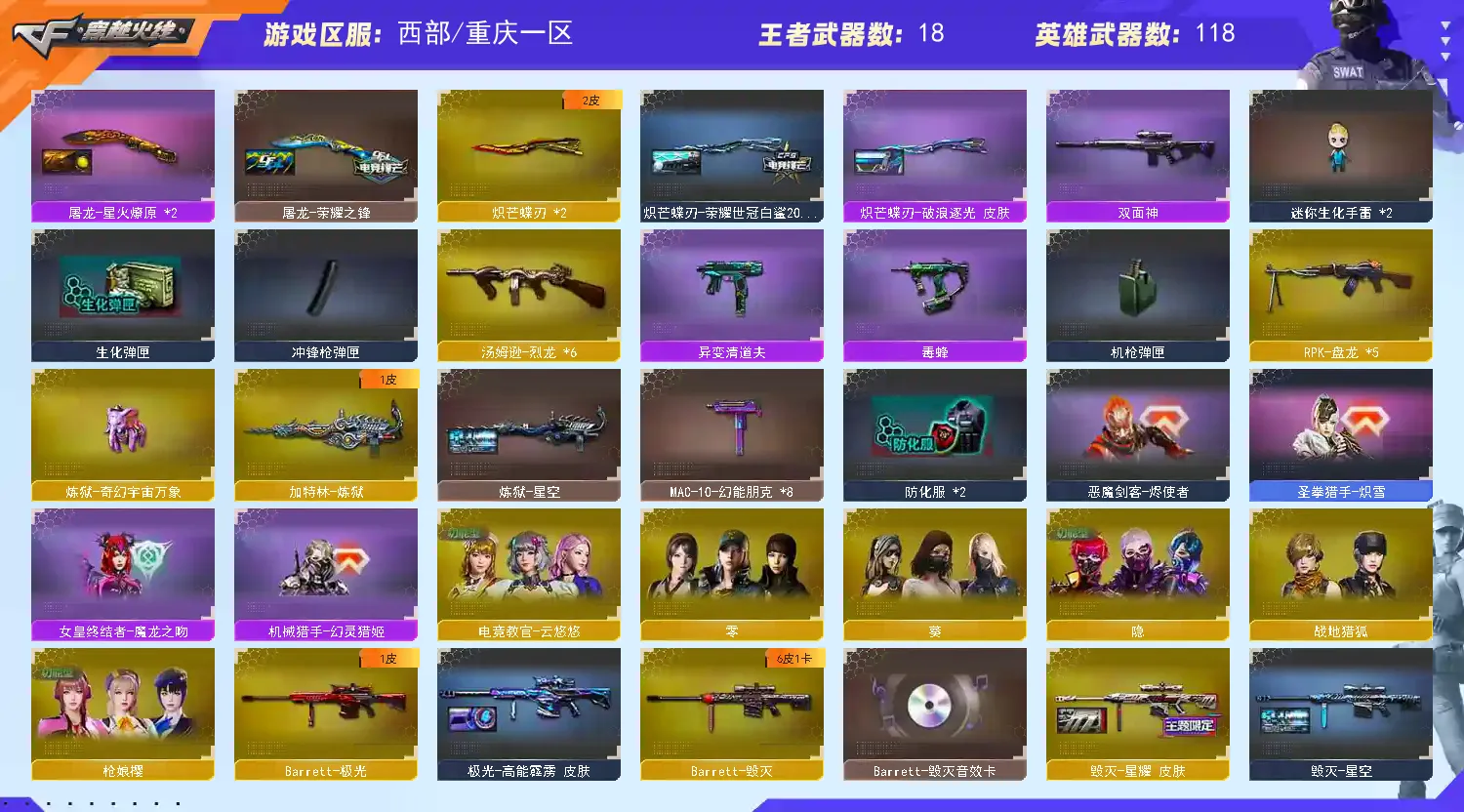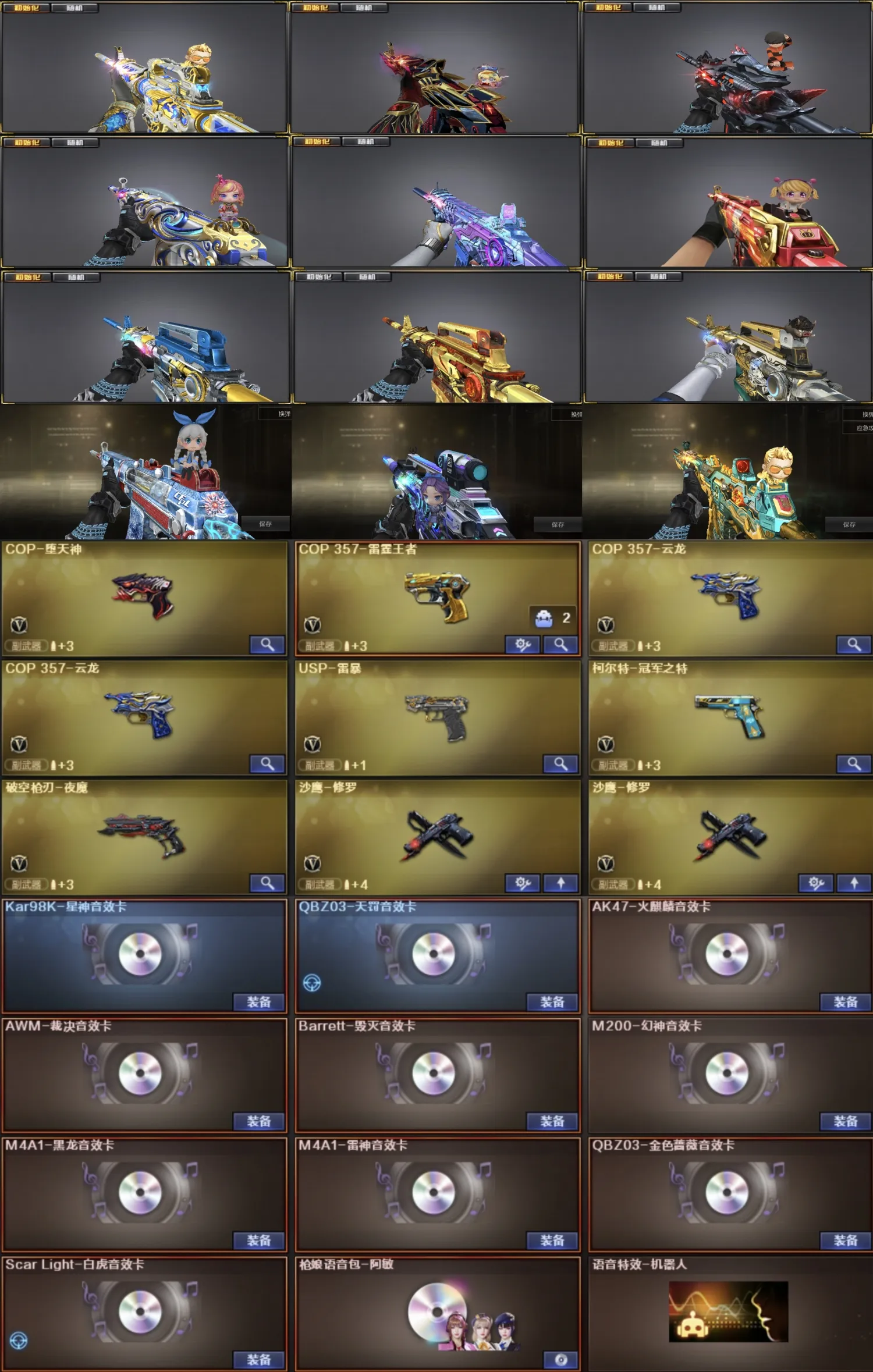 重要武器皮肤:幻神-电流骇客皮肤、幻神-宠儿-2021MVP、幻神-星耀 皮肤、星神-破竹皮肤、毁灭-战神张飞、毁灭-星空、毁灭-荣耀之怒、毁灭耀金皮肤、毁灭-墨兰皮肤、毁灭-星耀 皮肤、毁灭-秦师 皮肤、极光-高能霹雳 皮肤、AWM-天龙-传奇白鲨、裁决-流光秘银、火麒麟-CFSTAR、火麒麟-华夏之心、火麒麟-平天大圣、火麒麟-心动糖果、雷神-化蛇 皮肤、M4A1-干变-孔明皮肤、雷神-源计划2.0专属 皮肤、雷神-刘备 皮肤、雷神-荣耀之魄、雷神-虎将、雷神-脉冲核心、雷神-星空、黑骑士-破界皮肤、黑骑士-伏羲、黑骑士-地狱火、黑骑士-暗月、黑龙-能量核心、幻影-破浪逐光皮肤、金色蔷薇-枪娘阿敏 皮肤、白虎-霓虹机甲皮肤、白虎-虎啸皮肤、天罚-孙权 皮肤、超新星-兔兔战士 皮肤、战神-粉色甜心皮肤、炼狱-电子连击皮肤、炼狱-星空、炼狱-月 皮肤、烈火-熔核皮肤、麒麟刺-月皮肤、屠龙-荣耀之锋、屠龙-星火燎原、龙啸-冠军之啸、黑鲨-电流骇客皮肤、炽芒蝶刃-破浪逐光 皮肤、炽芒蝶刃-荣耀世冠白鲨2023皮肤