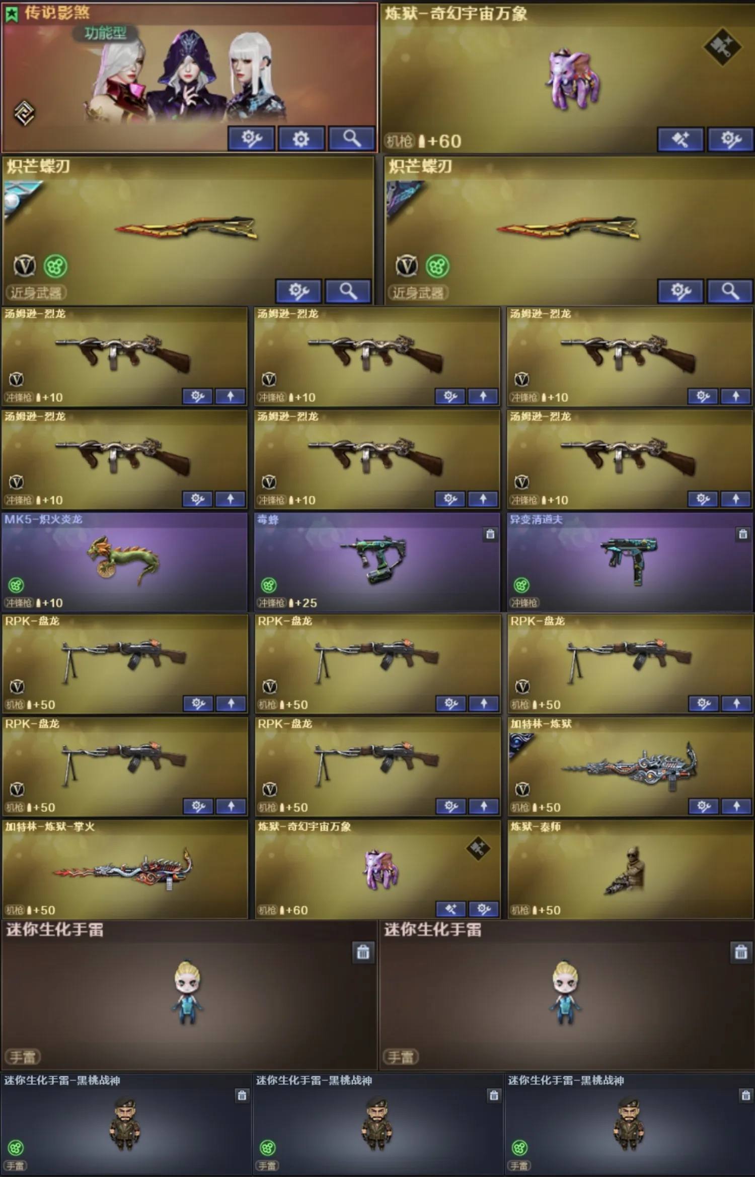 小人枪:M4A1-雷神-精英刀锋、火麒麟-灵狐、HK417-朱雀-蛇隐宗、Scar Light-马枪、王者M200-无畏金戈、AWM-灵狐-15周年嘉年华、炼狱-秦师、MK5-炽火炎龙、M37-葵、真的是手枪、COP-旗袍、夺魂、迷你深渊冰龙、迷你牛牛、迷你白狐、迷你宝贝、迷你波特博士