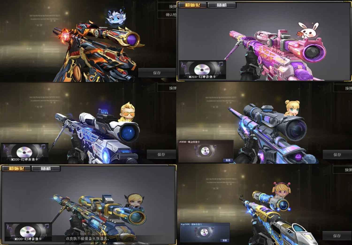 重要音效卡:AWM-裁决音效卡、Kar98K-星神音效卡、M200-幻神音效卡、 M4A1-黑龙音效卡、QBZ03-金色蔷薇音效卡、Scar Light-白虎音效卡、M4A1-雷神音效卡、Barrett-毁灭音效卡、AK47-火麒麟音效卡、QBZ03-天罚音效卡