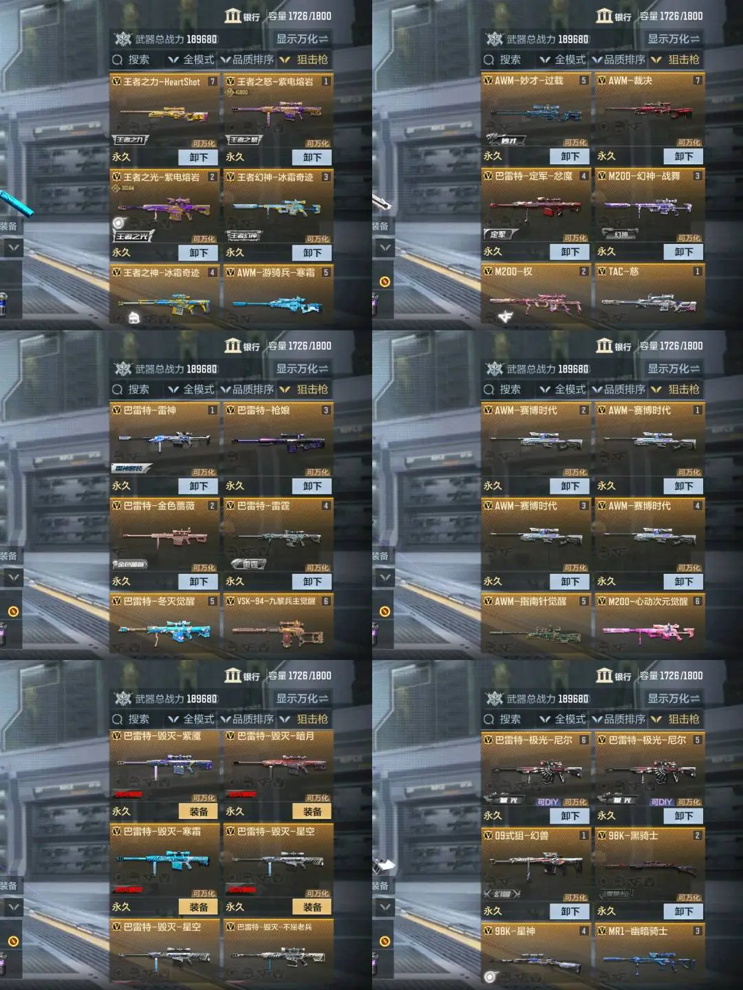 ❤️🔥狙击枪:紫电熔岩王怒至尊✨冰霜王者幻神至尊✨紫电熔岩王光套✨冰霜王者之神套✨女团王力✨M200权✨AWM游骑兵寒霜✨秒才过载✨定军忿魔套✨幻神战舞套✨慈✨裁决✨星神✨雷神✨巴雷特雷霆套✨金色蔷薇✨枪娘✨冬灭觉醒✨赛博时代✨M200心动次元觉醒✨