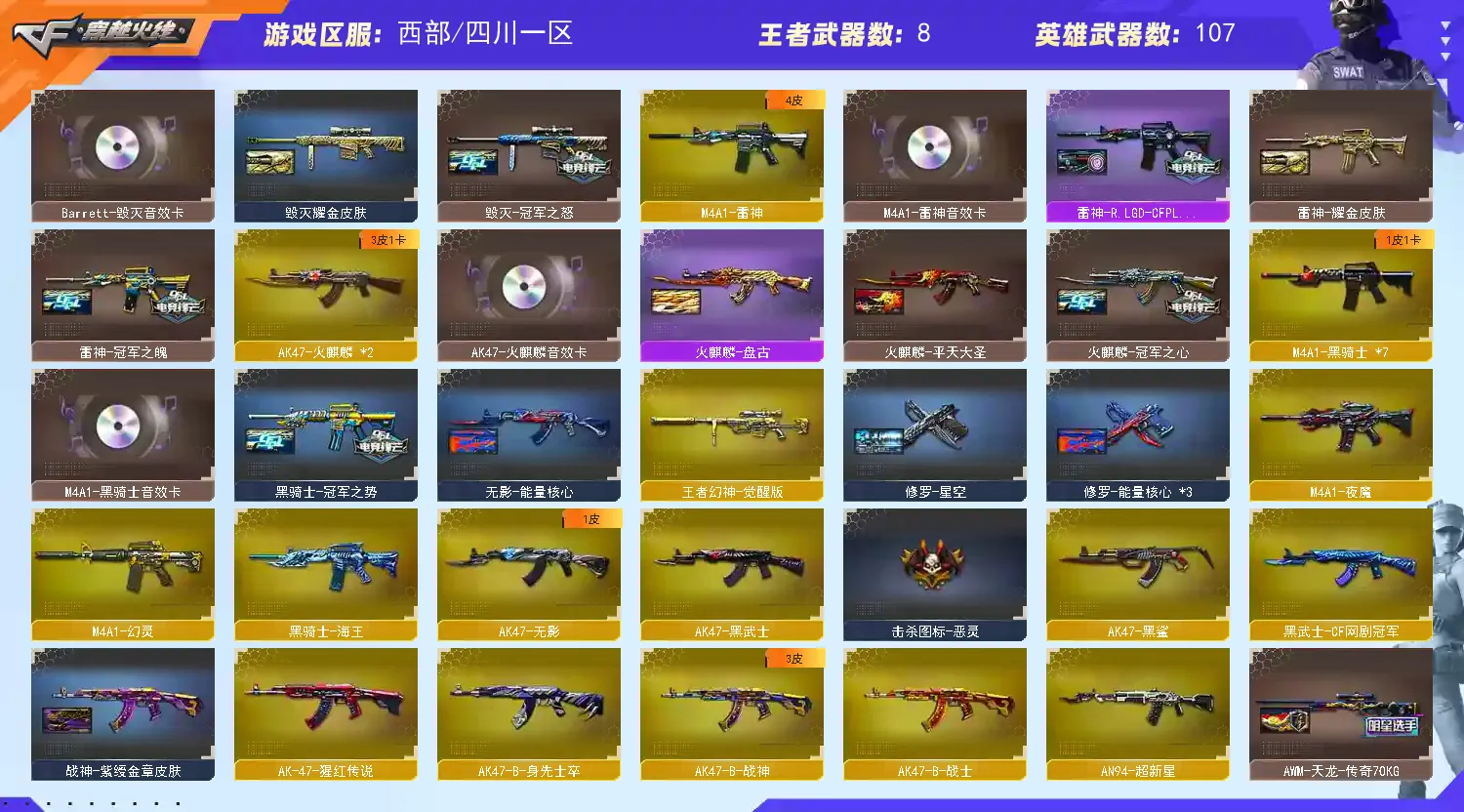【亮点解析 幻神三件套 生化高配】【m200幻神+音效卡+周瑜】【王者幻神】【6黑骑士 6烈龙 盘龙*4 炼狱 斯太尔蝴蝶】【传说光耀 传说暗裔】【scar白虎】【qbz金色蔷薇】【hk417朱雀】【火麒麟+卡+冠军之心】【雷神+卡+s18冠军+冠军之魄】【黑骑士+卡+冠军之势】【毁灭+卡+cfs2018+冠军之怒】【极光】【裁决】 【武器:无影 黑武士 超新星 夜魔 幻灵 王者之心 王者之魄 王者之势 王者冰魄 海王 天龙】 【7手呛:修罗*2 沙鹰天神*2 夜魔*2 cop幻灵】 【9刀具:屠龙 龙啸 擎天 麒麟刺*2 马来剑夜魔 幻灵之峰*2 王者之啸】 【10雷套:夜魔雷*5 幻灵雷*5】 【小人呛:火麒麟灵狐 火麒麟绝迹 雷神小红】 【音效卡:雷神音效卡 火麒麟音效卡 幻神音效卡 黑骑士音效卡 毁灭音效卡 】 【四防角色:王者春 王者魅影】