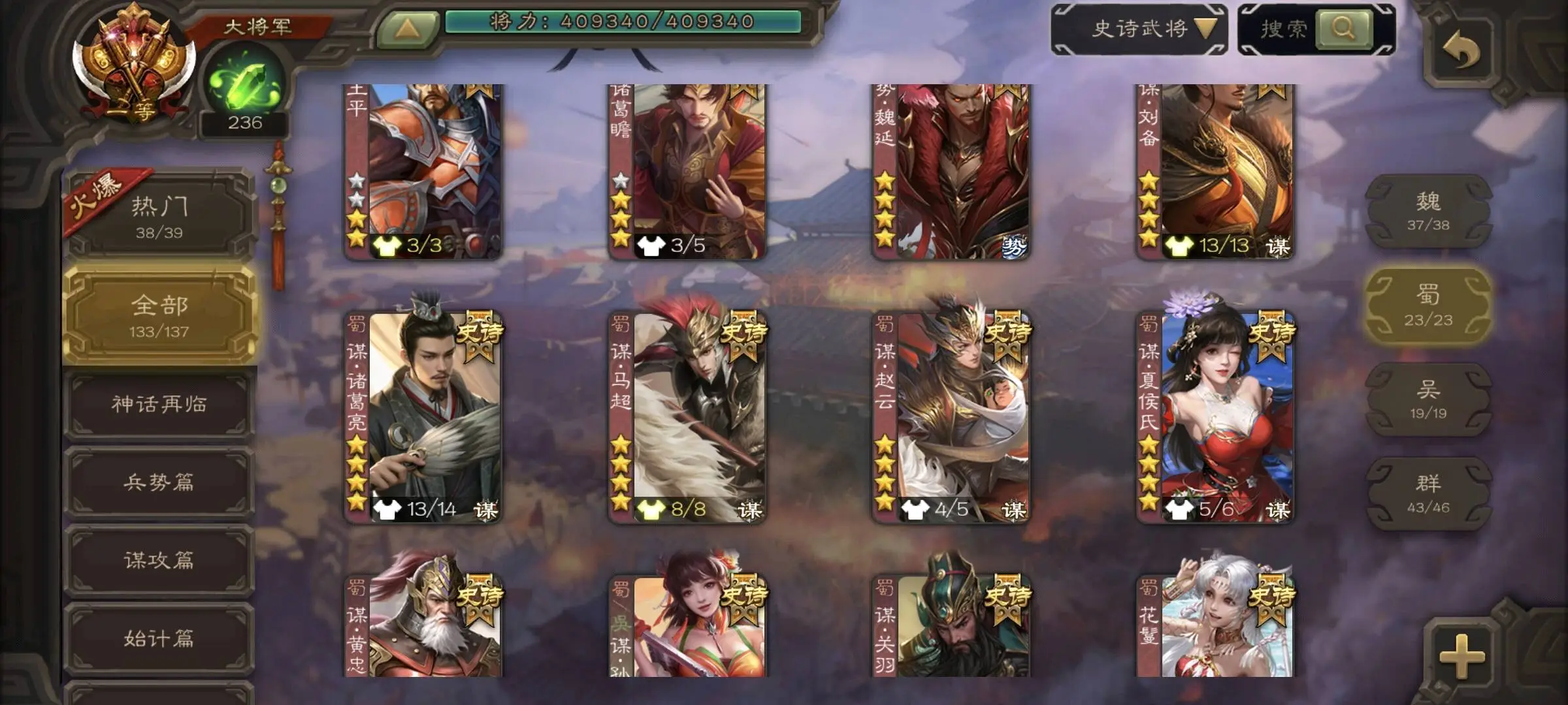 蜀——王平,诸葛瞻,谋马超,谋赵云,谋夏侯氏,花鬘,界黄忠,马云騄,张星彩,董允,赵襄,关索,沙摩柯,周群,谯周,谋刘备,某黄忠,谋孙尚香,鲍三娘,傅佥,谋诸葛亮,谋关羽,势魏延