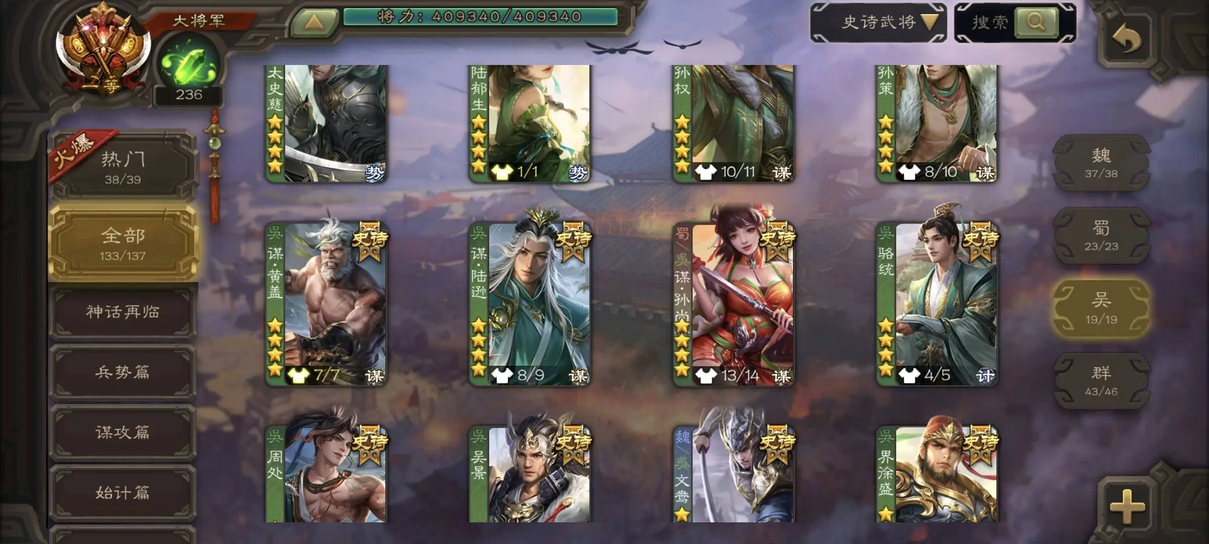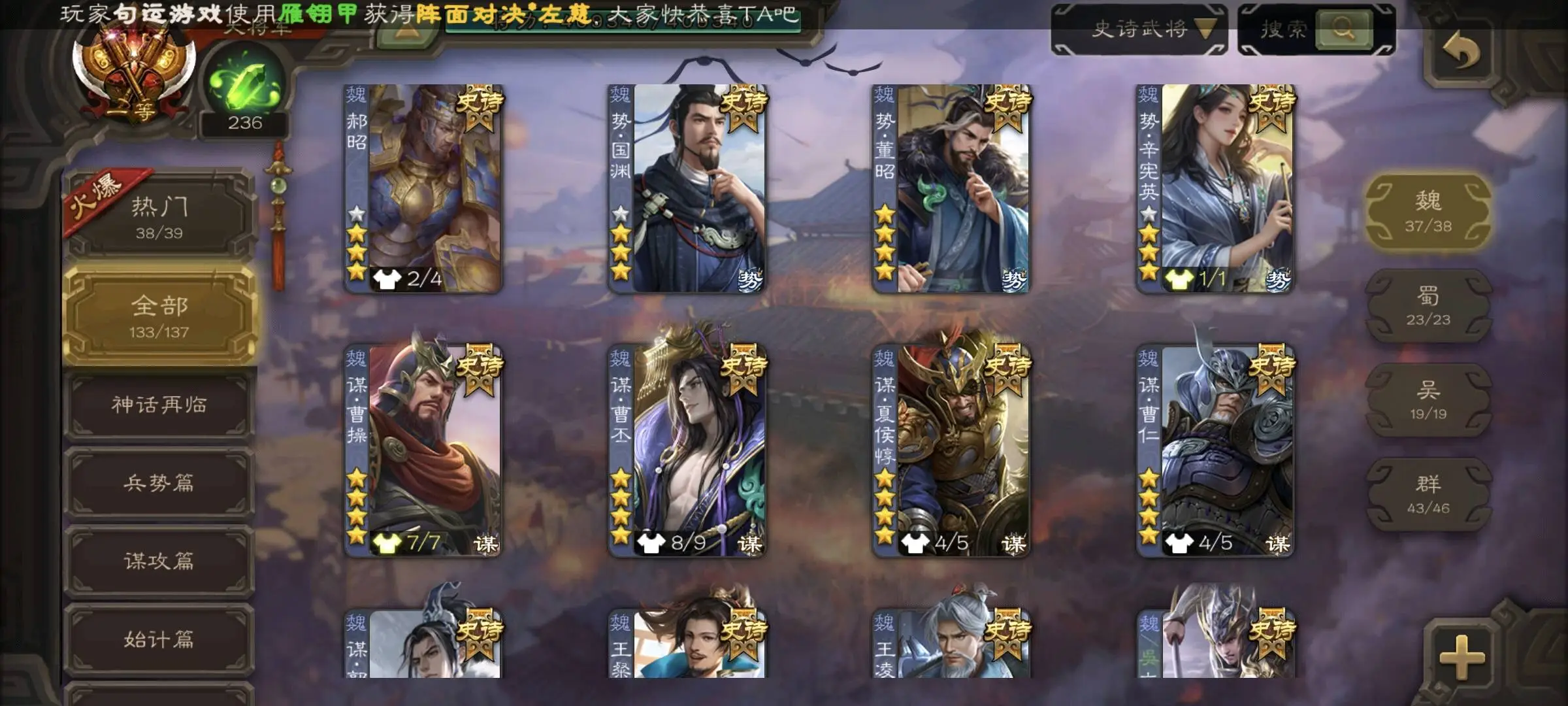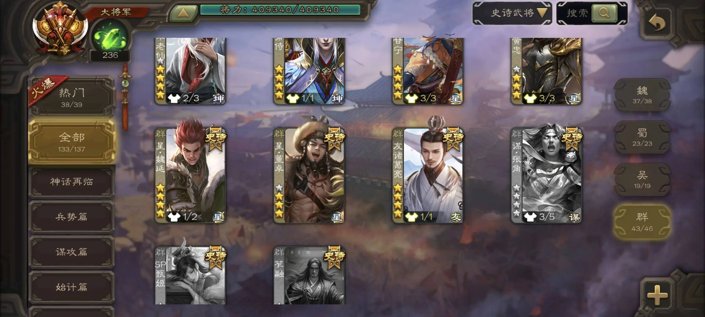 群——左慈,许攸,谋貂蝉,杜预,刘璋,界左慈,沮授,界李儒,张让,麹义,陶谦,士燮,司马徽,卑弥呼,刘焉,王允,苏飞,公孙康,兀突骨,祢衡,庞德公,郑玄,星甘宁,张仲景,黄甫嵩,界沮授,审配,徐荣,陈登,张琪瑛,灵雎,杨彪,裴秀,十常侍,星黄忠,星魏延,谋公孙瓒,友诸葛亮,势董卓,势于吉,势吕布