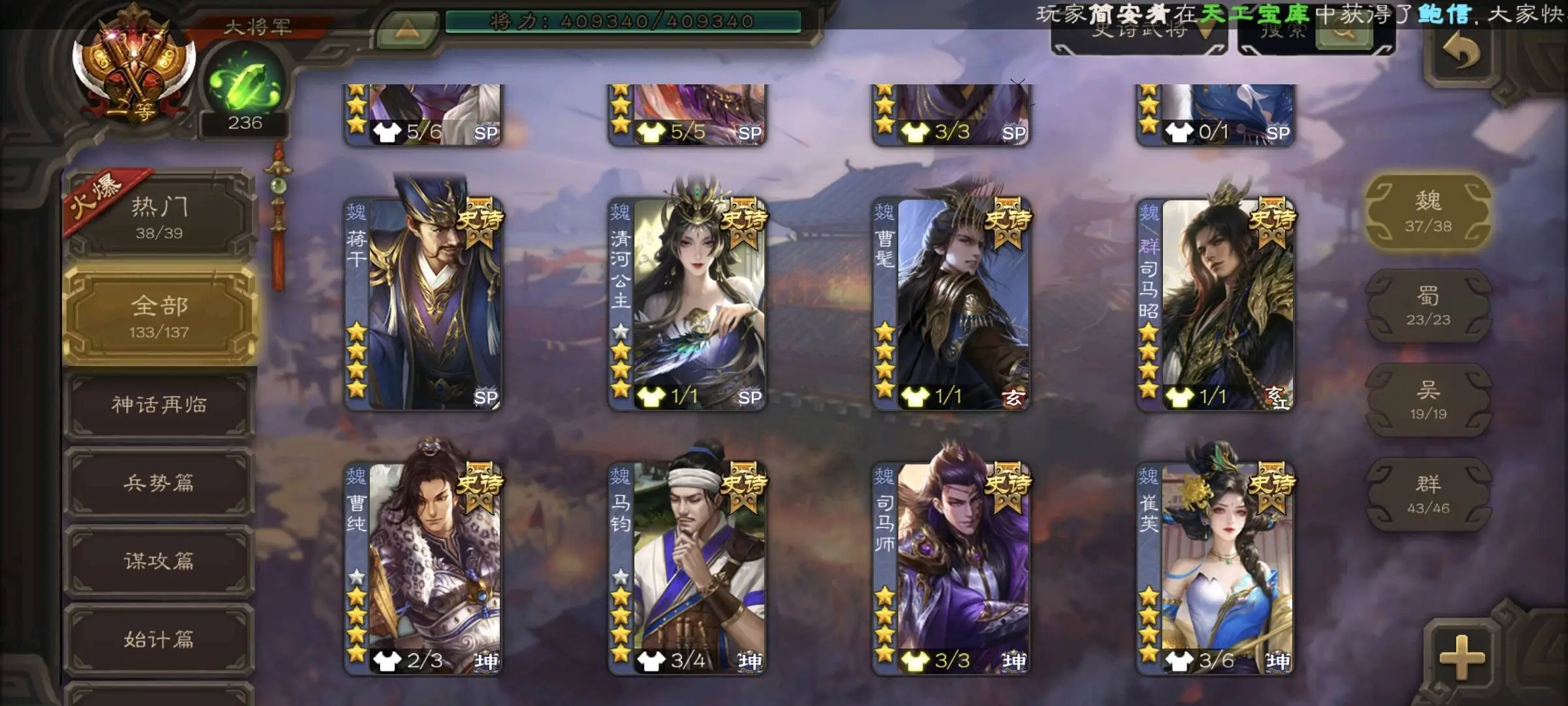 魏——郝昭,谋曹操,谋曹仁,王粲,王凌,文鸯,张昌蒲,界于禁,界钟会,界曹真,熙康,程昱,戏志才,杨修,陈琳,王朗,刘哔,王元姬,羊徽瑜,sp司马昭,曹纯,马钧,司马师,曹婴,郭女王,星周不疑,谋曹丕,蒋干,谋夏侯惇,曹髦,势董昭,崔芙,势国渊,势辛宪英