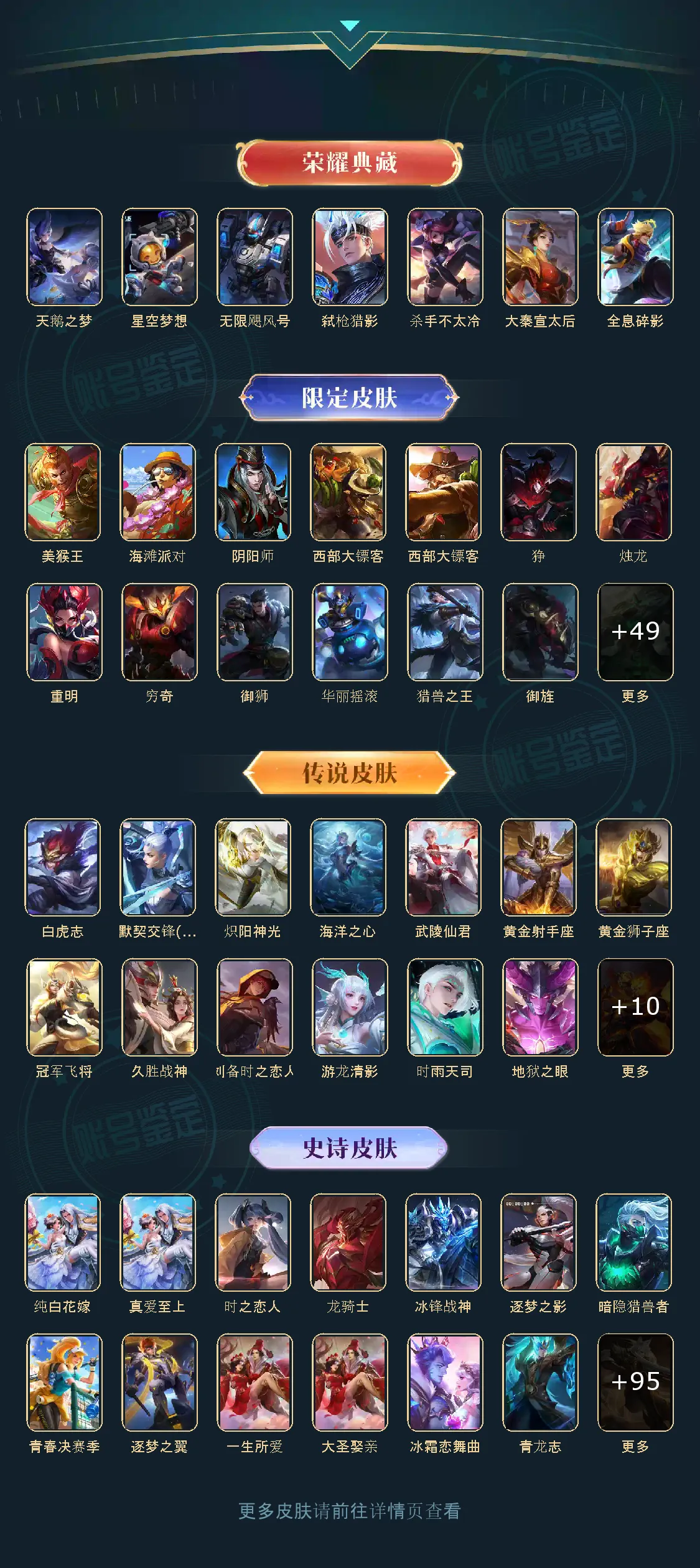 贵族等级V10,英雄数量123,典藏皮肤数7,皮肤数量356,天鹅之梦/杀手不太冷/大秦宣太后/星空梦想/无限飓风号/全息碎影/白虎志/久胜战神