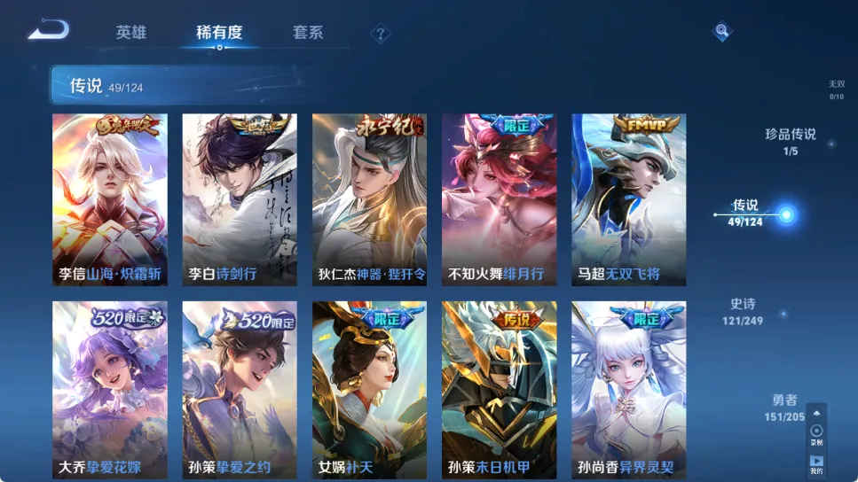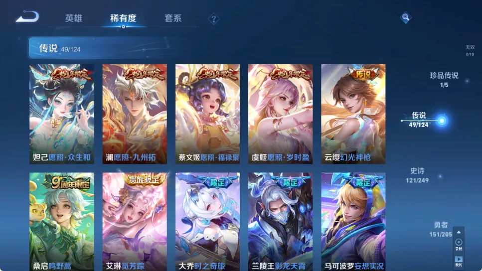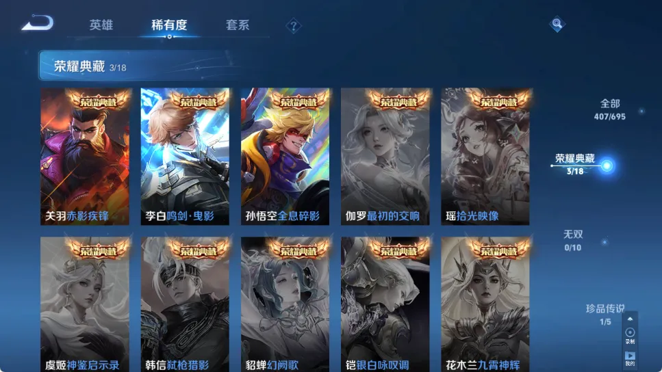 贵族等级V10,英雄数量123,典藏皮肤数3,皮肤数量407,全息碎影/鸣剑·曳影/补天/异界灵契