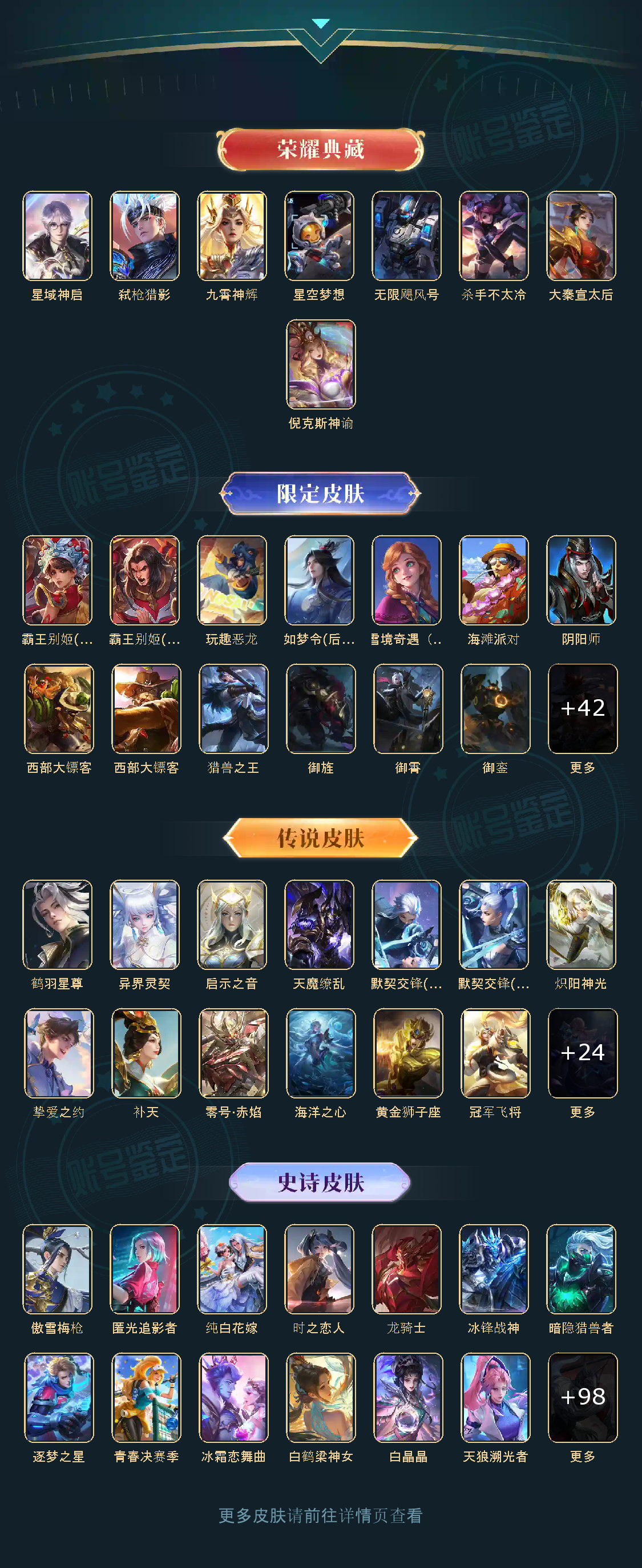 贵族等级V10,英雄数量123,典藏皮肤数7,皮肤数量376,冰锋战神/街头霸王/纯白花嫁/天魔缭乱/杀手不太冷/大秦宣太后/星空梦想/无限飓风号/黄金狮子座/冰霜恋舞曲/太华/久胜战神/梁祝/倪克斯神谕/白鹤梁神女/匿光追影者/龙胆/星域神启/奔雷神使/补天/异界灵契/启示之音/傲雪梅枪/淬星耀世/时雨天司