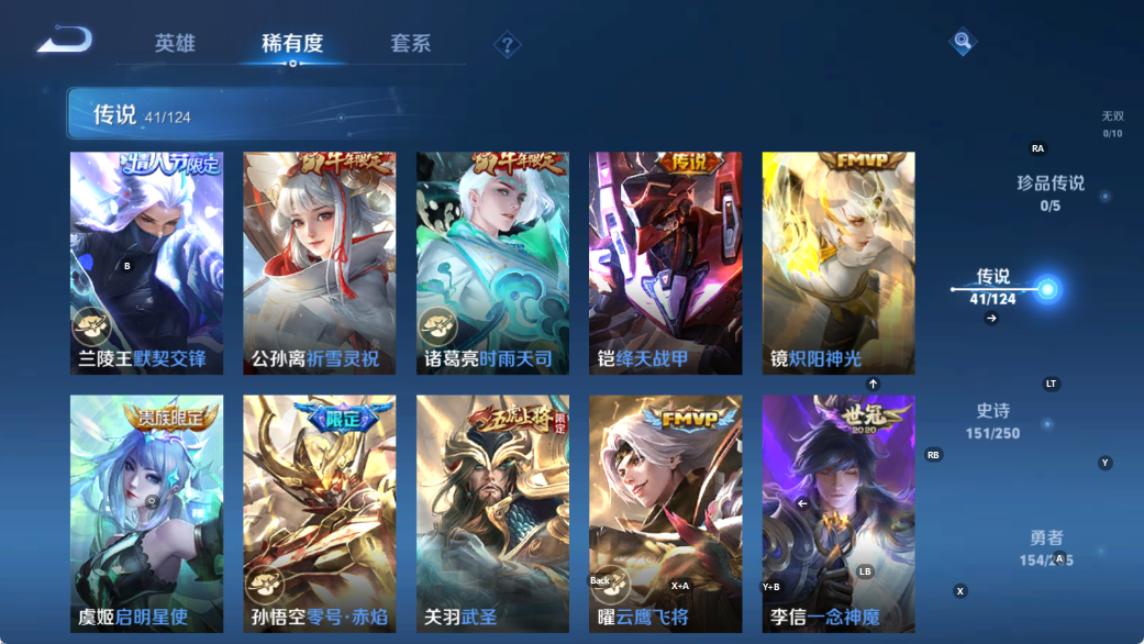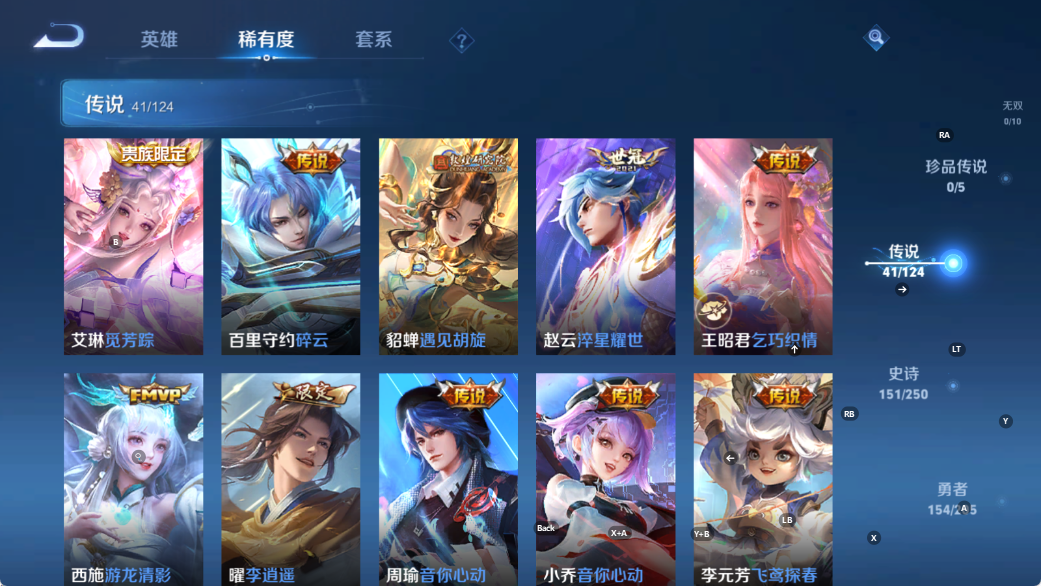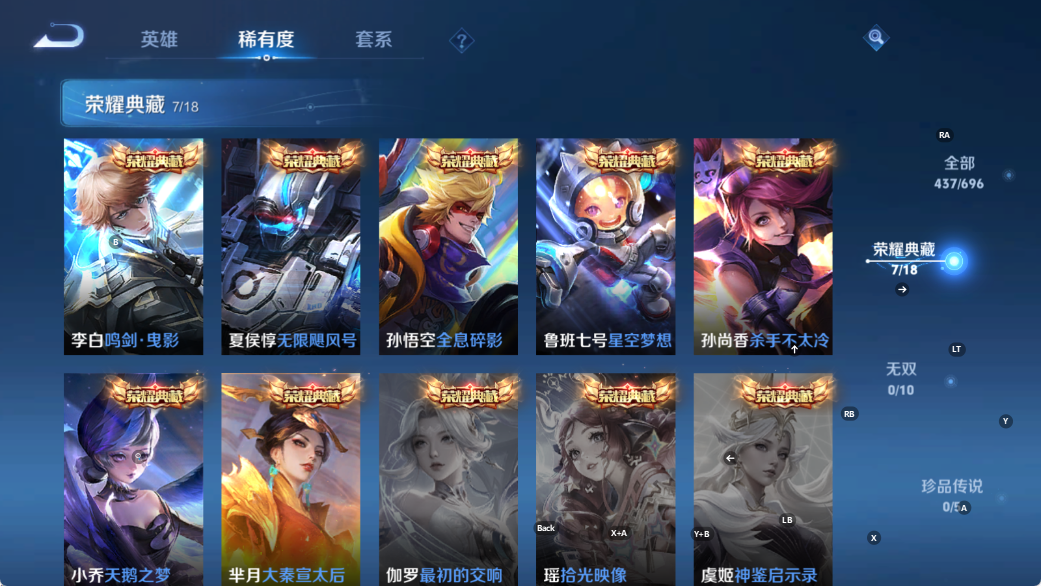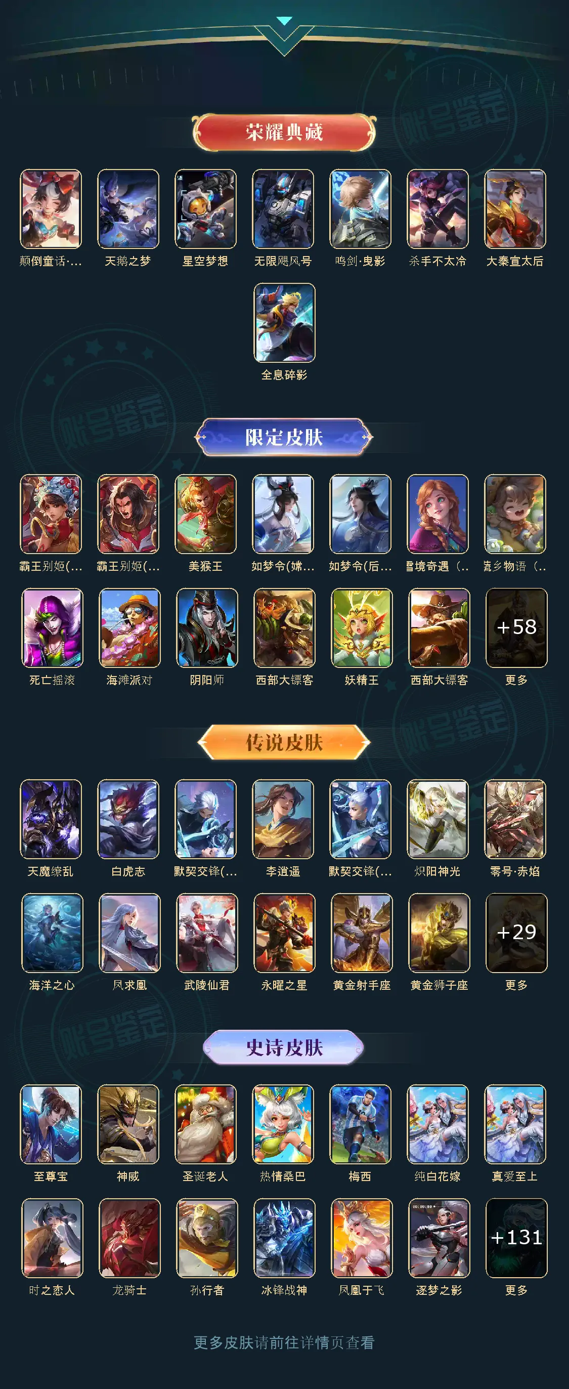 贵族等级V10,英雄数量123,典藏皮肤数7,皮肤数量437,天鹅之梦/杀手不太冷/大秦宣太后/星空梦想/无限飓风号/全息碎影/鸣剑·曳影/李逍遥