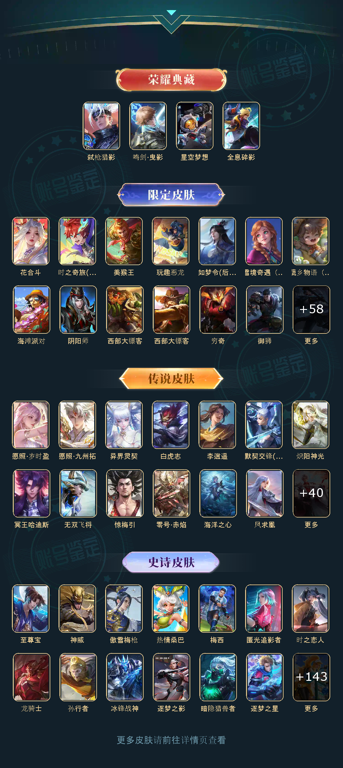 贵族等级V10,英雄数量123,典藏皮肤数4,皮肤数量444,