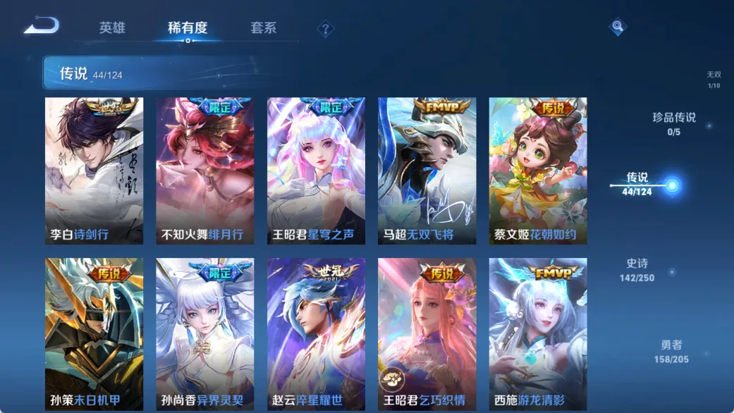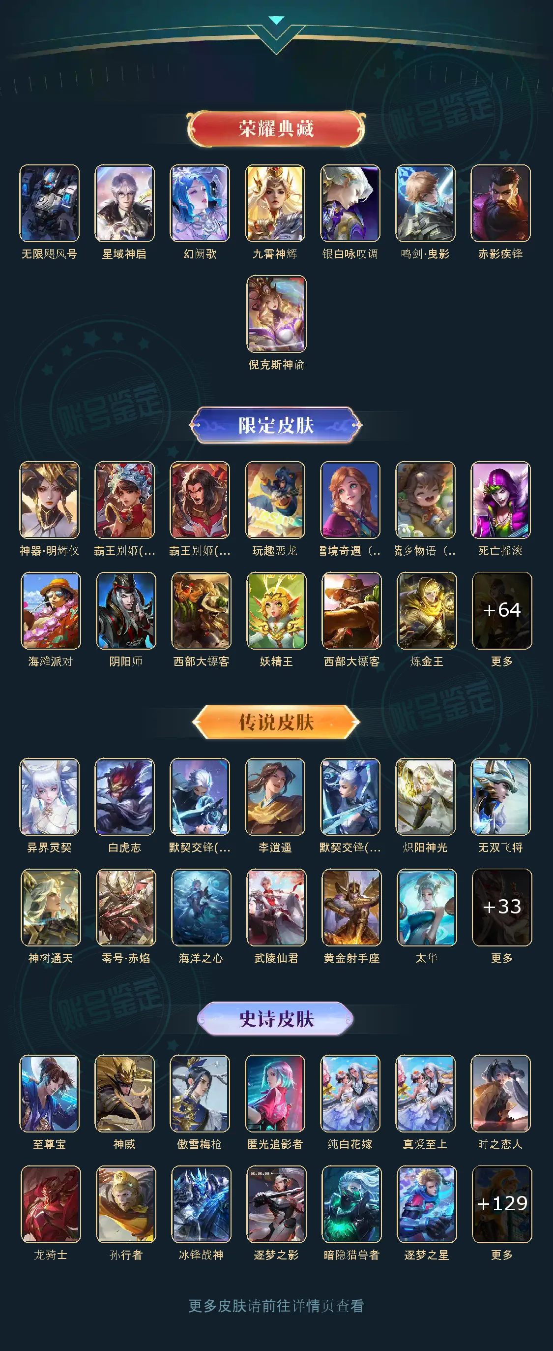 无限飓风号,鸣剑·曳影,赤影疾锋,星域神启,幻阙歌,九霄神辉,银白咏叹调,神器·明辉仪,白虎志,默契交锋(兰陵王),李逍遥,默契交锋(花木兰),零号·赤焰,炽阳神光,至尊宝,神威,纯白花嫁,真爱至上,匿光追影者,无双飞将,异界灵契,神树通天,傲雪梅枪