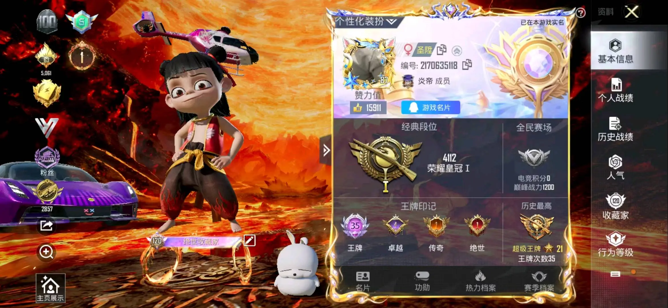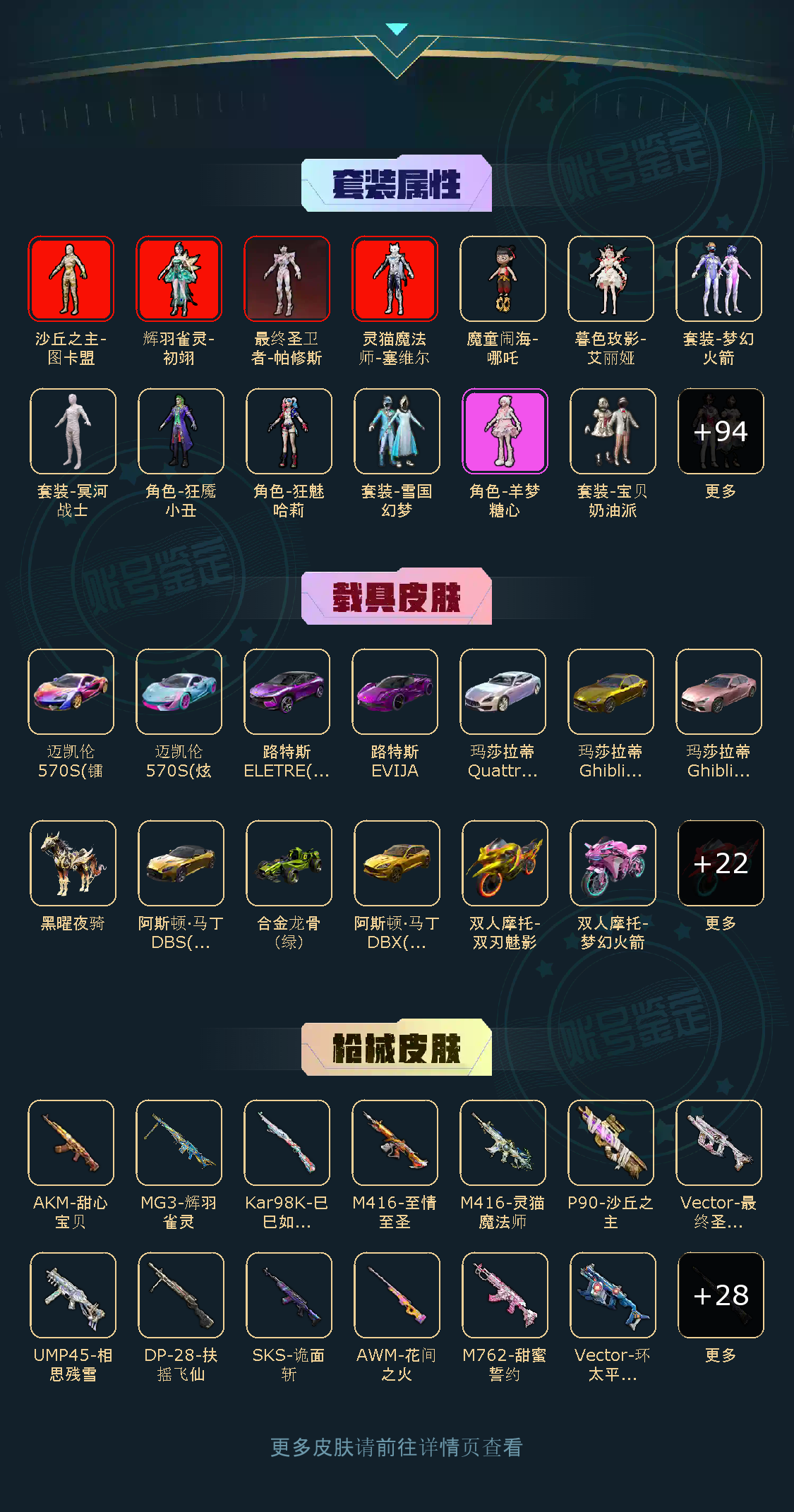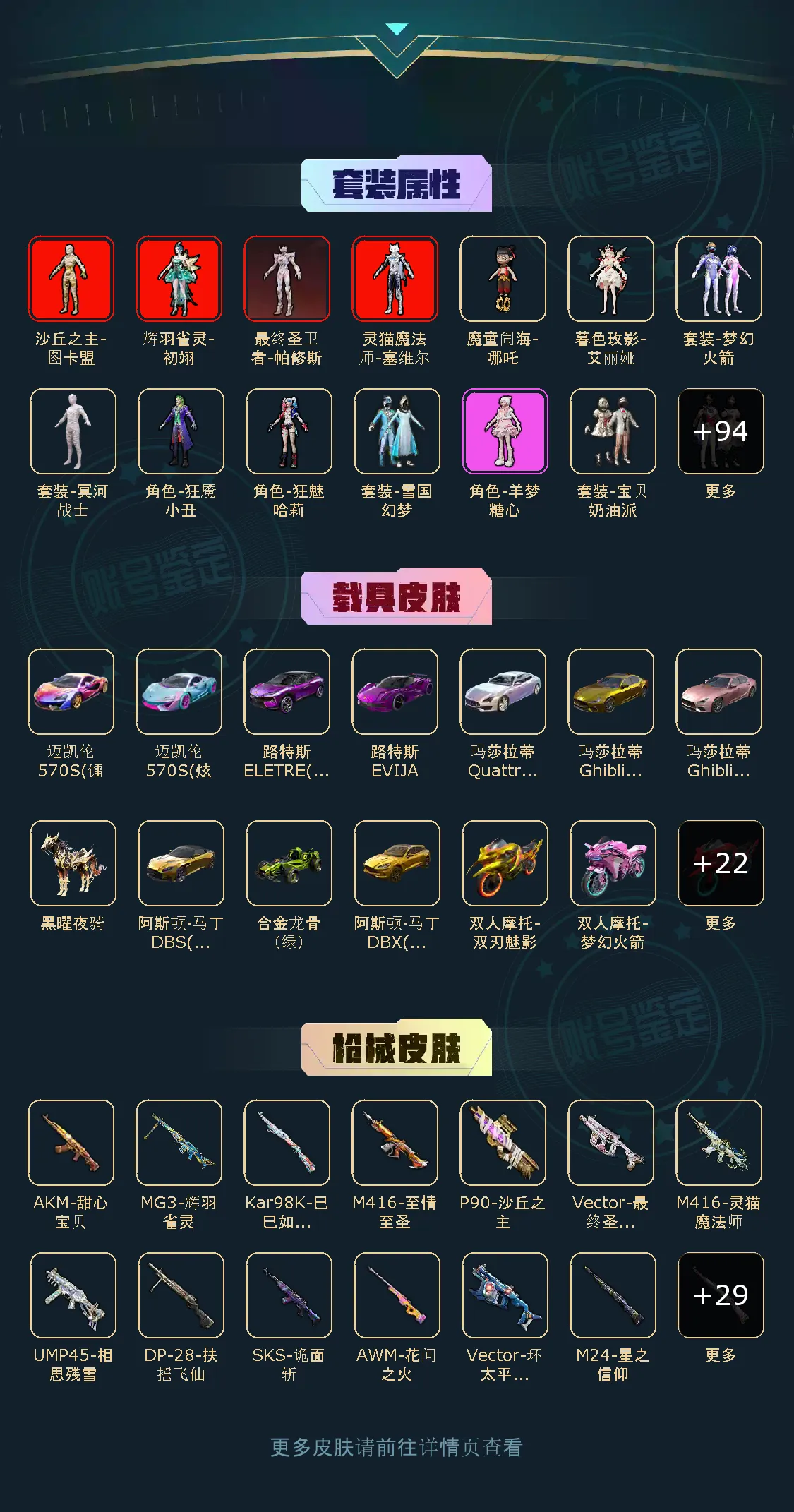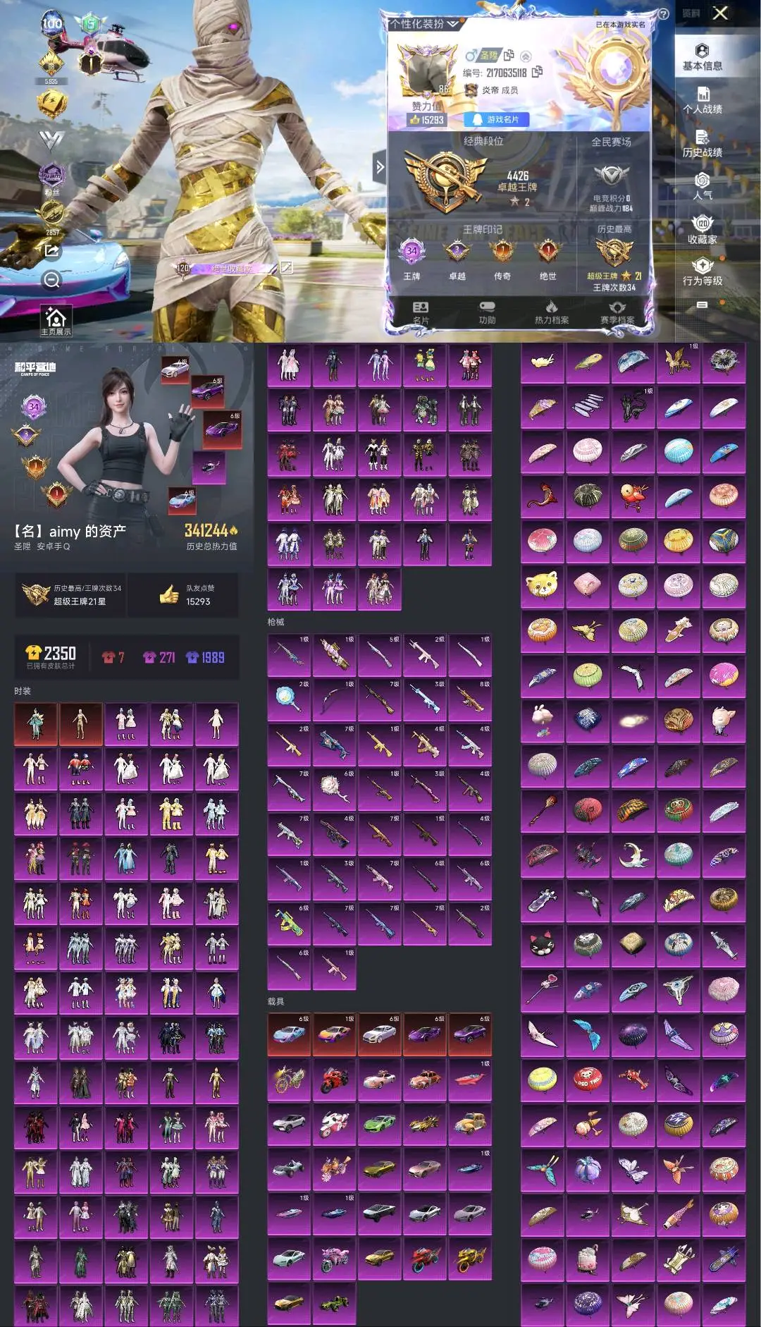 不朽星钻Ⅳ106粉,35载具,505套装,38王牌印记,超级王牌21星历史最高段,374218热力值 平底锅-仲夏莫吉托/平底锅-林间仙鹿/M416-灵猫魔法师/AKM-甜心宝贝/SCAR-L-梦幻火箭/SCAR-L-童趣迷兔/AUG-星之彼岸/M762-甜心娃娃/M762-激战未来/GROZA-香水柠檬/M416-暖熊萌萌/M416-心之恋语/M16A4-葫芦兄弟/M416-五爪金龙/M16A4-垂柳戏鸭/GROZA-焦糖拿铁/M416-至情至圣/M762-甜蜜誓约/SCAR-L-魔童闹海 哪吒/M417-第五大道/SKS-诡面斩/Mini14-荧光虫舞/MK20-H-海螺星光/DP-28-暗夜鎏金/DP-28-扶摇飞仙/MG3-辉羽雀灵/DP-28-枪炮玫瑰/MG3-洛神天依/DP-28-豹影疾电/汤姆逊-怪笑疯兔/Vector-环太平洋/Vector-最终圣卫者/UMP45-相思残雪/P90-沙丘之主/爆炸猎弓-雪梅暗香/Kar98K-伏魔团/AWM-花间之火/Kar98K-巳巳如意/Kar98K-未来歌姬/Kar98K-暗翼战神/M24-星之信仰/玛莎拉蒂Ghibli(金)/俏皮小熊猫/特斯拉Roadster(尊享铂)/特斯拉Roadster(沁心粉)/特斯拉Roadster(水滴蓝)/阿斯顿·马丁DBS(金)/玛莎拉蒂Quattroporte(幻星粉)/玛莎拉蒂Ghibli(粉)/萌喵橘座/路特斯ELETRE(电光紫)/阿斯顿·马丁DBX(金)/路特斯ELETRE(花绽灰)/鬼马风驰/快艇-自由的鲸/快艇-塞莎KL27(深潜蓝)/快艇-塞莎KL27(霓虹粉)/快艇-塞莎KL27(鲸之蓝)/特斯拉Cybertruck(镭光铂)/金龙耀世/灵鼠银迹/合金龙骨(绿)/兰博基尼Aventador(翡翠绿)/迈凯伦570S(炫冰蓝)/路特斯EVIJA(电光紫)/迈凯伦570S(镭射紫)/软萌羊咩咩/暮色幽蹄/黑曜夜骑/辉羽雀灵自行车/双人摩托-梦幻火箭/双人摩托-双刃魅影(红)/双人摩托-双刃魅影(金)/极速兔兔/杜卡迪PanigaleV4(杜卡迪红)/踏焰逐风摩托车/