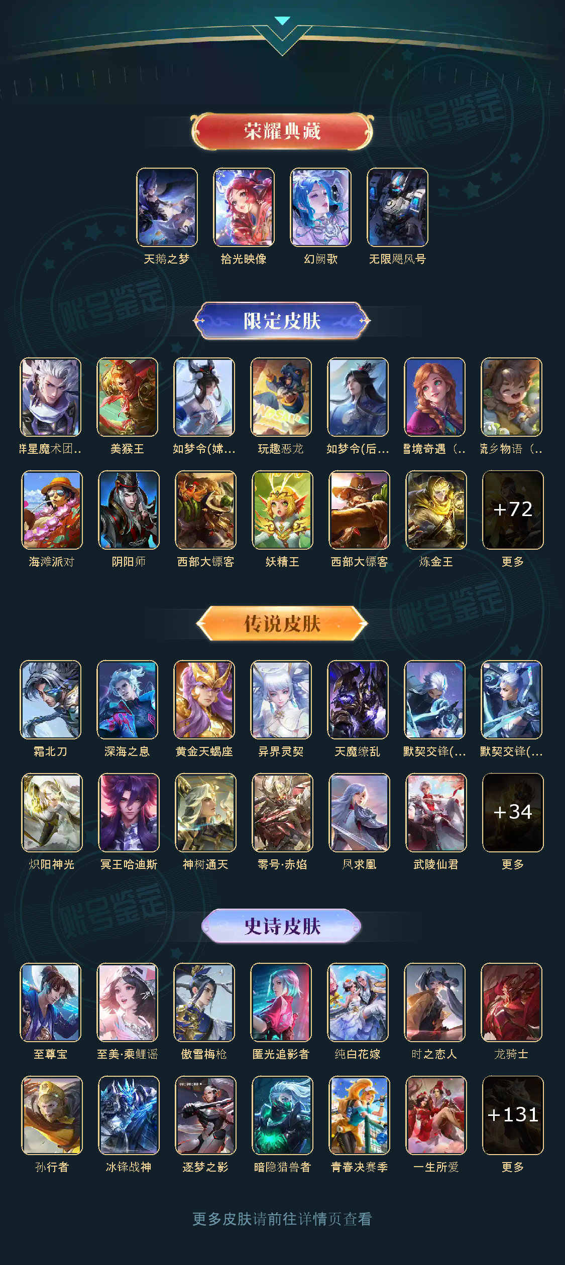 贵族等级V10,英雄数量124,典藏皮肤数4,皮肤数量460,冰锋战神街头霸王天鹅之梦纯白花嫁天魔缭乱至尊宝凤求凰逐梦之影武陵仙君神奇女侠无限飓风号黄金狮子座一生所爱朱雀志久胜战神飞衡梁祝匿光追影者遇见胡旋武圣孙行者异界灵契傲雪梅枪淬星耀世时雨天司