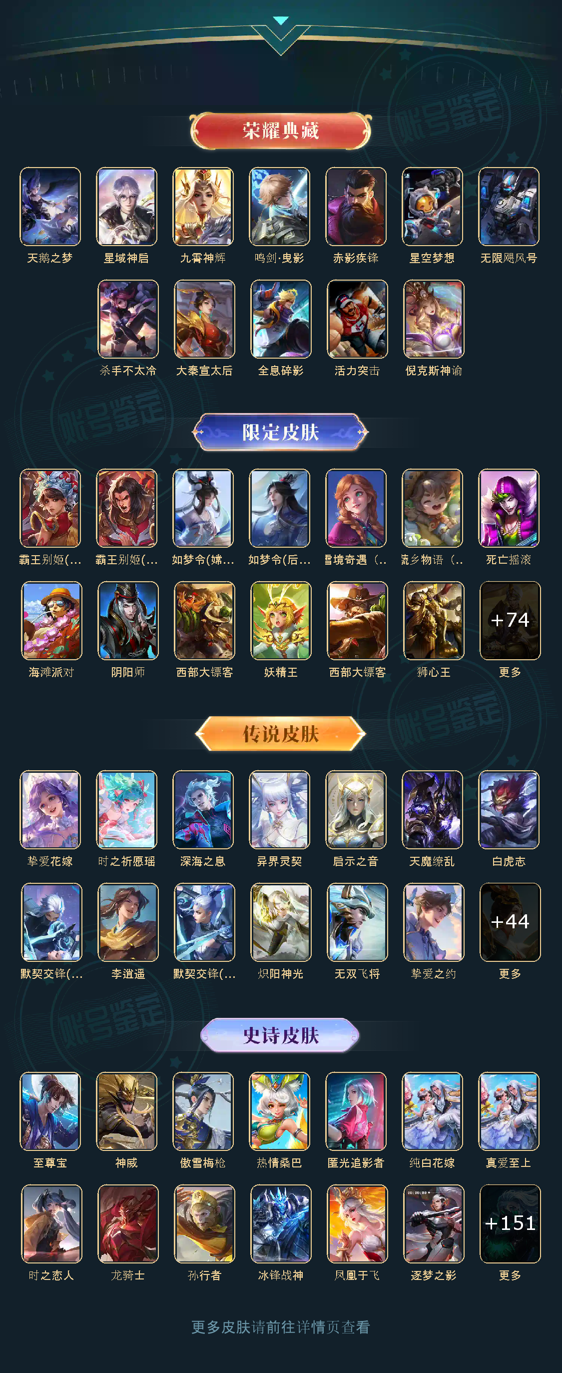 贵族等级V10,英雄数量125,典藏皮肤数11,皮肤数量502,天鹅之梦/星空梦想/无限飓风号/全息碎影/活力突击/倪克斯神谕/鸣剑·曳影/星域神启