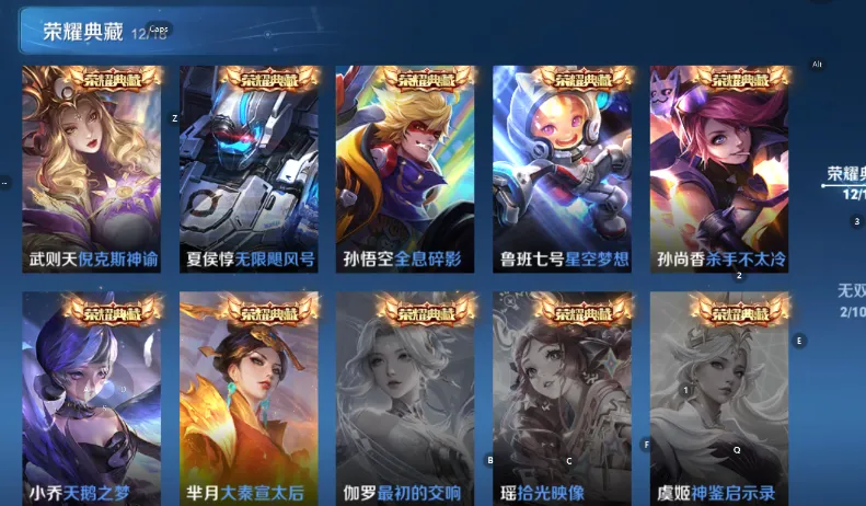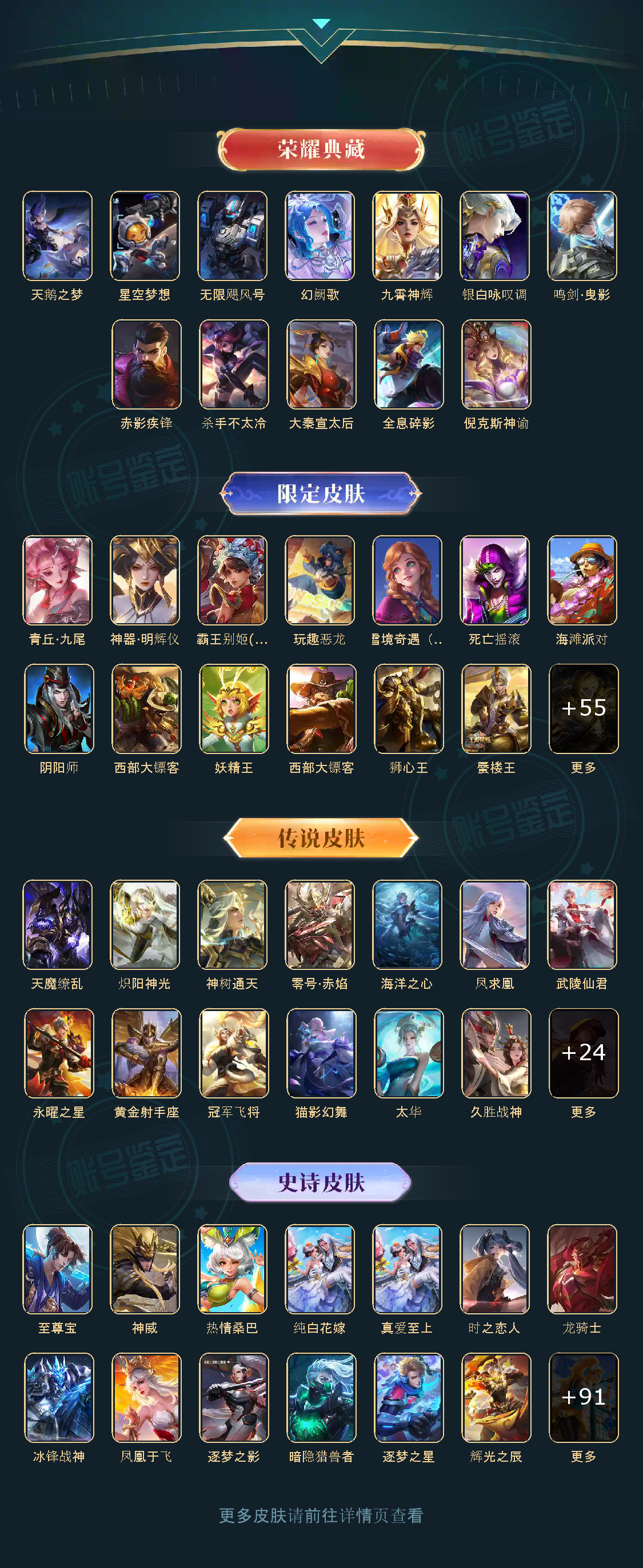 贵族等级V10,英雄数量123,典藏皮肤数13,皮肤数量386,天鹅之梦/杀手不太冷/大秦宣太后/星空梦想/无限飓风号/全息碎影/倪克斯神谕