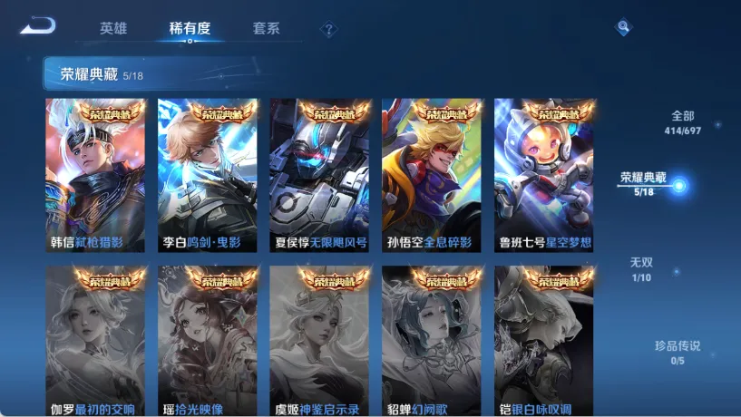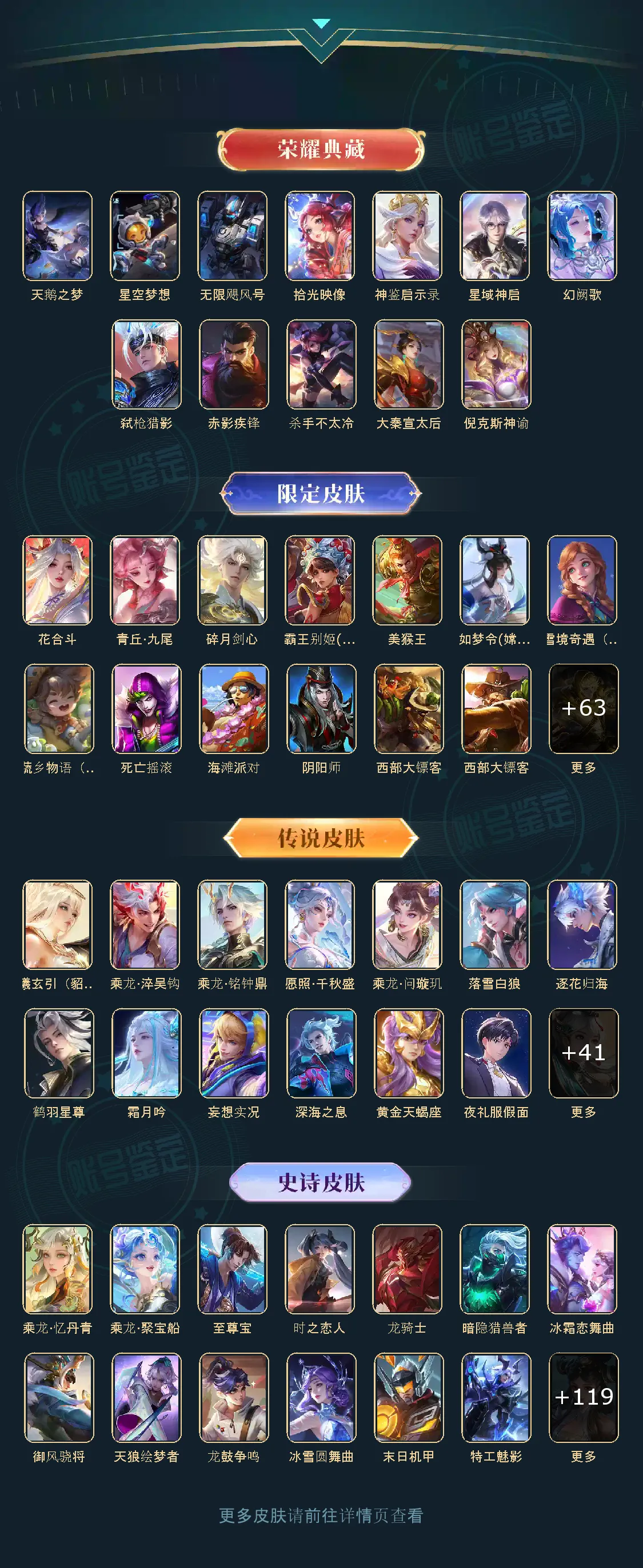 天鹅之梦,星空梦想,无限飓风号,神鉴启示录,赤影疾锋,星域神启,幻阙歌,拾光映像,弑枪猎影,碎月剑心,青丘·九尾,炽阳神光,乘龙·问璇玑,乘龙·淬吴钩,乘龙·铭钟鼎,乘龙·聚宝船,乘龙·忆丹青,至尊宝,落雪白狼,花合斗,逐花归海,鹤羽星尊,曦玄引(貂蝉),愿照·千秋盛,霜月吟,妄想实况,深海之息,黄金天蝎座,夜礼服假面,补天,神树通天,鹤归松栖(云缨)