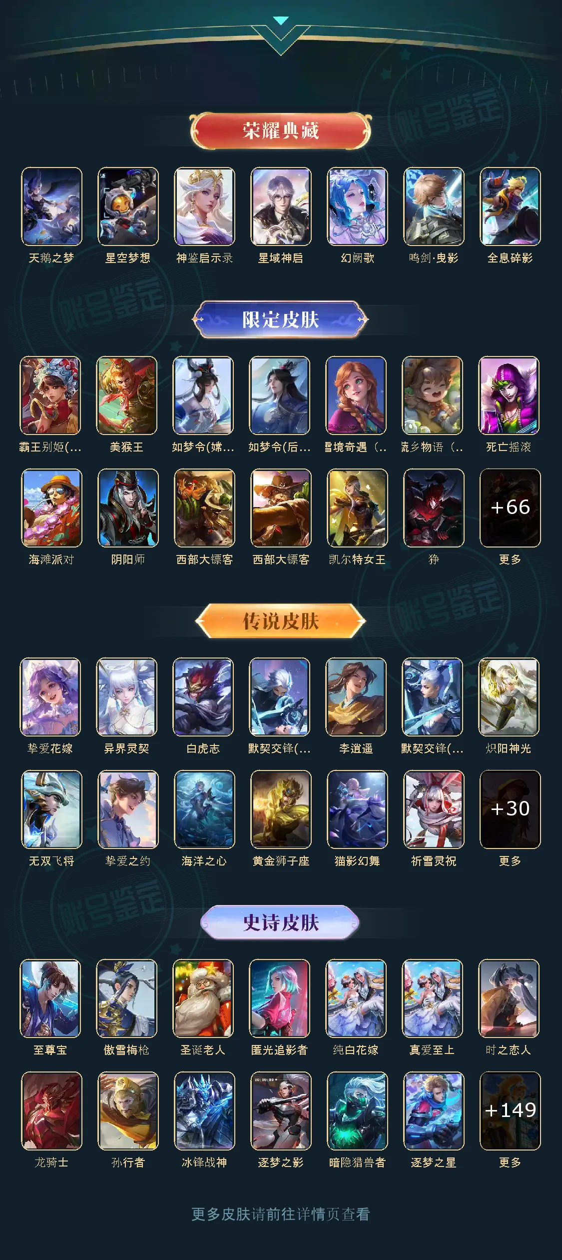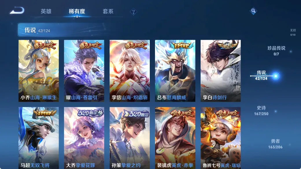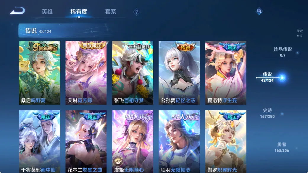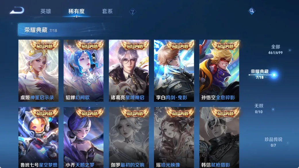 贵族等级V10,英雄数量125,典藏皮肤数7,皮肤数量461,天鹅之梦/星空梦想/全息碎影/鸣剑·曳影/星域神启