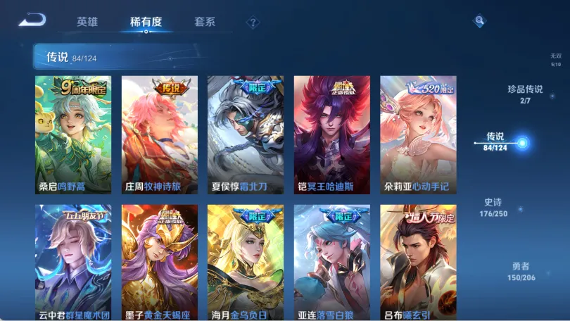 拾光映像,弑枪猎影,群星魔术团(韩信),碎月剑心,青丘·九尾,时之魔女,天魔缭乱,白虎志,李逍遥,默契交锋(花木兰),怪盗基德,炽阳神光,江户川柯南,乘龙·问璇玑,乘龙·淬吴钩,乘龙·铭钟鼎,乘龙·聚宝船,乘龙·忆丹青,神威,冥王哈迪斯,心动手记(朵莉亚),落雪白狼,无双飞将,至美·化雀舞,时之祈愿瑶,挚爱之约,挚爱花嫁,花合斗,霜北刀,逐花归海,琥珀纪元(马超),至美·乘鲤谣,曦玄引(貂蝉),霜月吟,妄想实况,埋骨钱,黄金天蝎座,夜礼服假面,补天,惊梅引,异界灵契,启示之音,心动手记(海诺),神树通天
