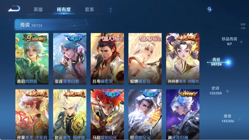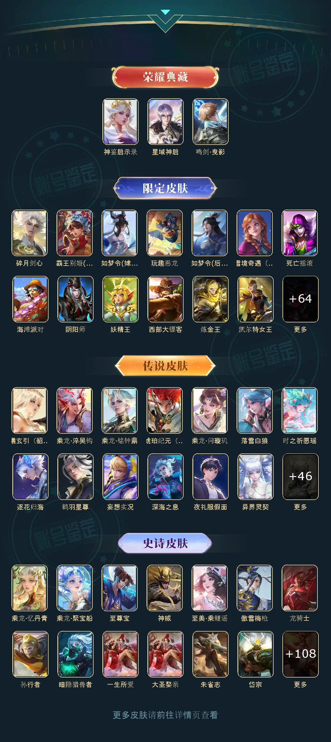 鸣剑·曳影,神鉴启示录,星域神启,碎月剑心,白虎志,李逍遥,炽阳神光,乘龙·问璇玑,乘龙·淬吴钩,乘龙·铭钟鼎,乘龙·聚宝船,乘龙·忆丹青,至尊宝,神威,落雪白狼,无双飞将,时之祈愿瑶,挚爱之约,逐花归海,琥珀纪元(马超),至美·乘鲤谣,鹤羽星尊,曦玄引(貂蝉),妄想实况,深海之息,夜礼服假面,补天,异界灵契,启示之音,鹤归松栖(云缨),傲雪梅枪