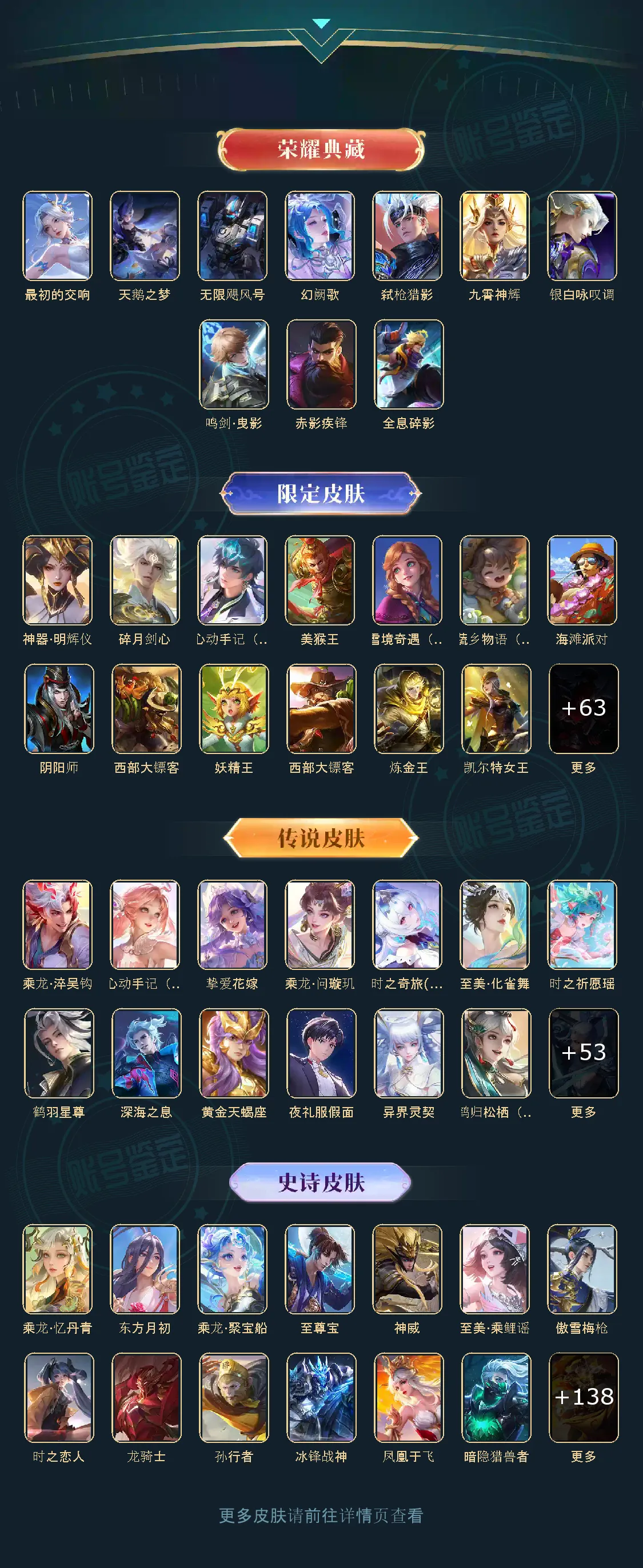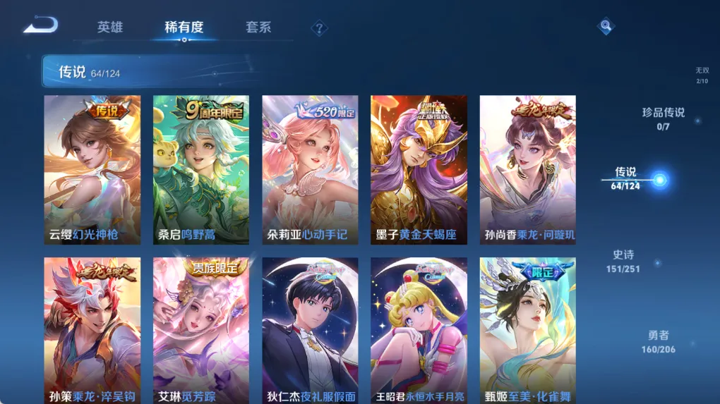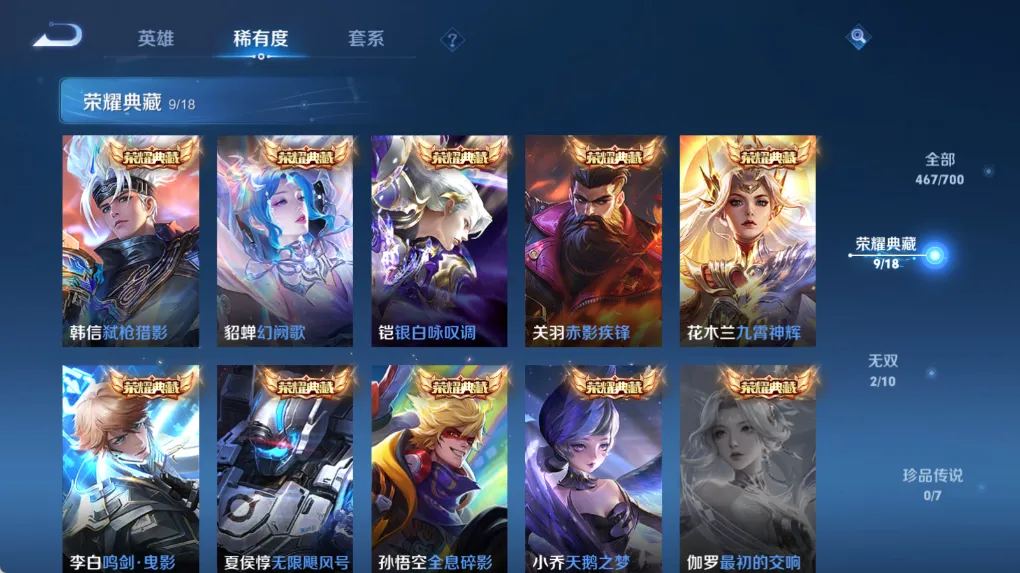 贵族等级V10,英雄数量125,典藏皮肤数9,皮肤数量467,
