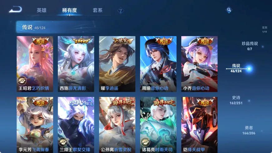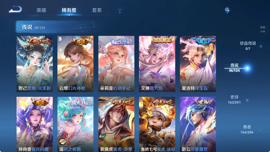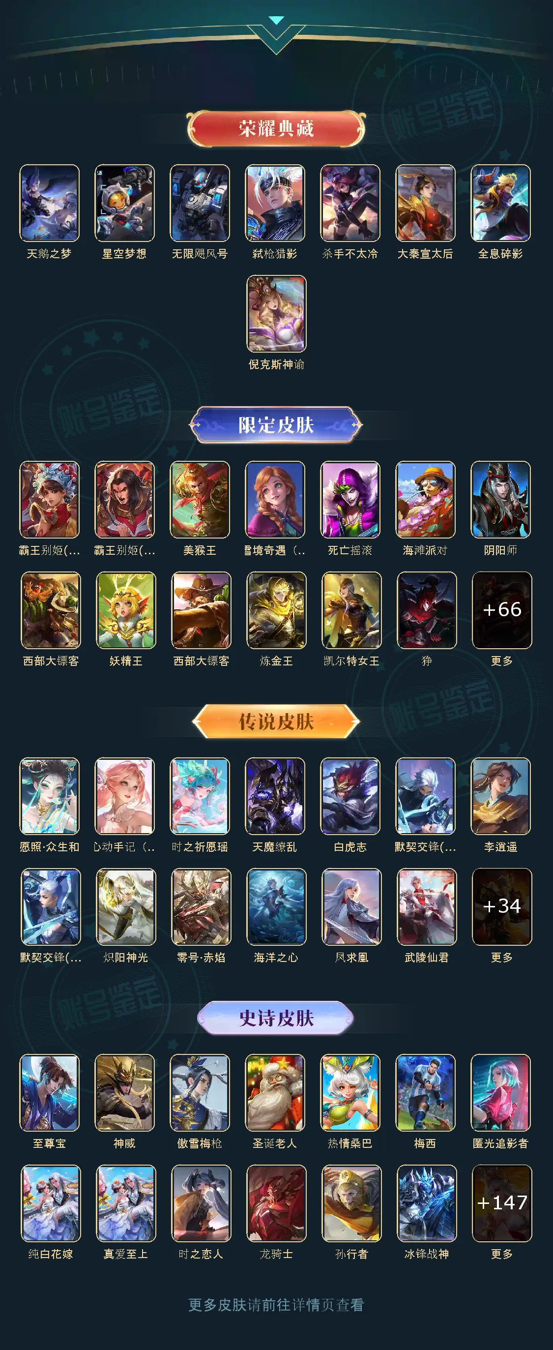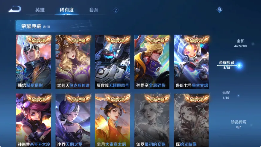 贵族等级V10,英雄数量124,典藏皮肤数8,皮肤数量467,天鹅之梦/大秦宣太后/无限飓风号/全息碎影/倪克斯神谕