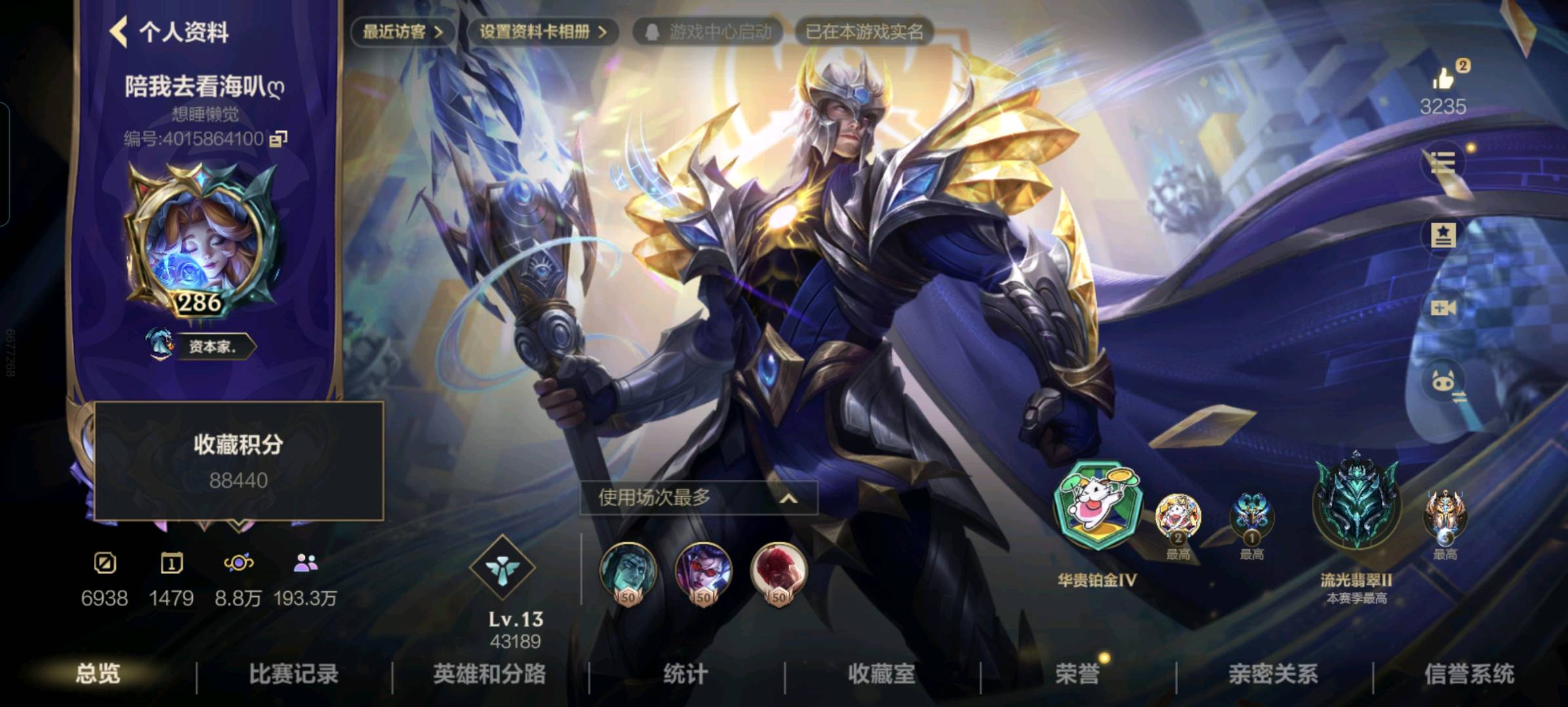 8w9收藏分,538皮肤,皇子冠军皮有炫彩,豹女新皮肤,灵魂莲华系列几乎全,水晶玫瑰:卡莎艾希吸血鬼佛耶戈至臻格温。6个神话皮。排位娱乐随便玩,如果强制下线了,等15分钟就好了。号里东西别动,谢谢!
