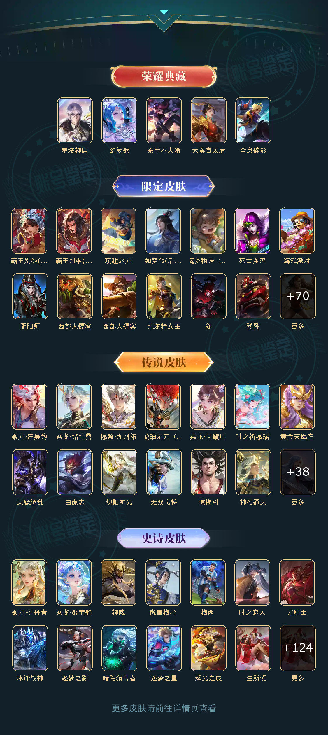 贵族等级V10,英雄数量123,典藏皮肤数5,皮肤数量443,杀手不太冷/大秦宣太后/全息碎影/星域神启
