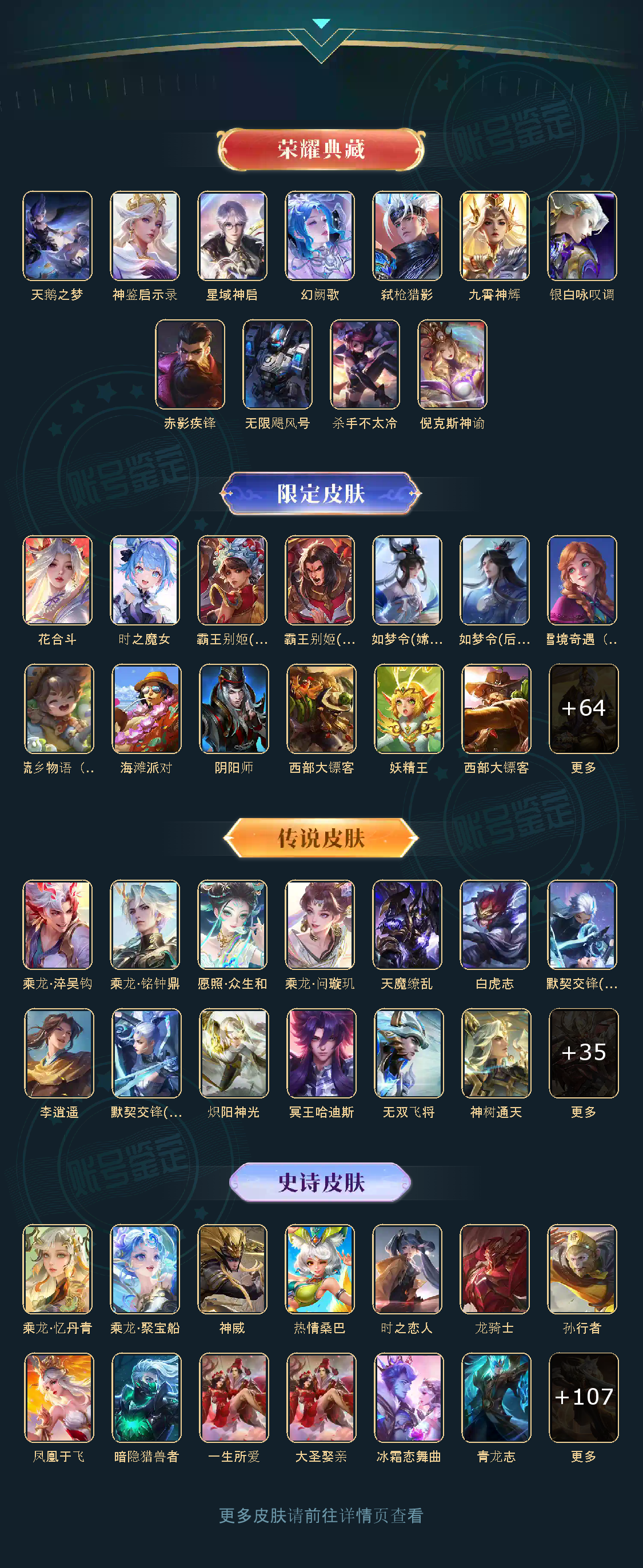 贵族等级V10,英雄数量125,典藏皮肤数10,皮肤数量411,杀手不太冷/无限飓风号/倪克斯神谕/星域神启