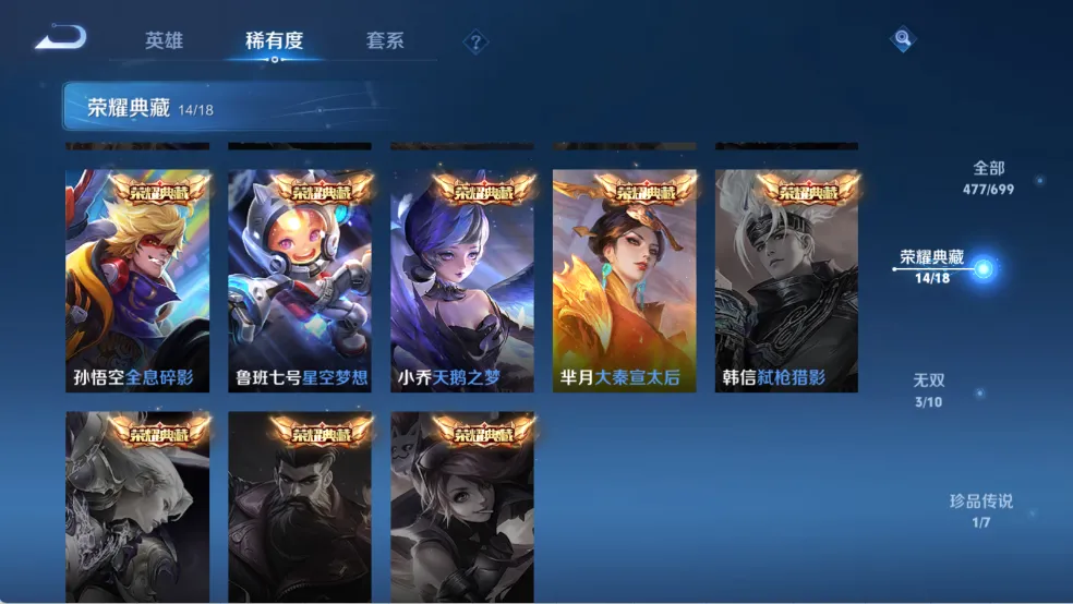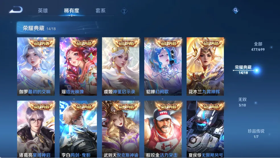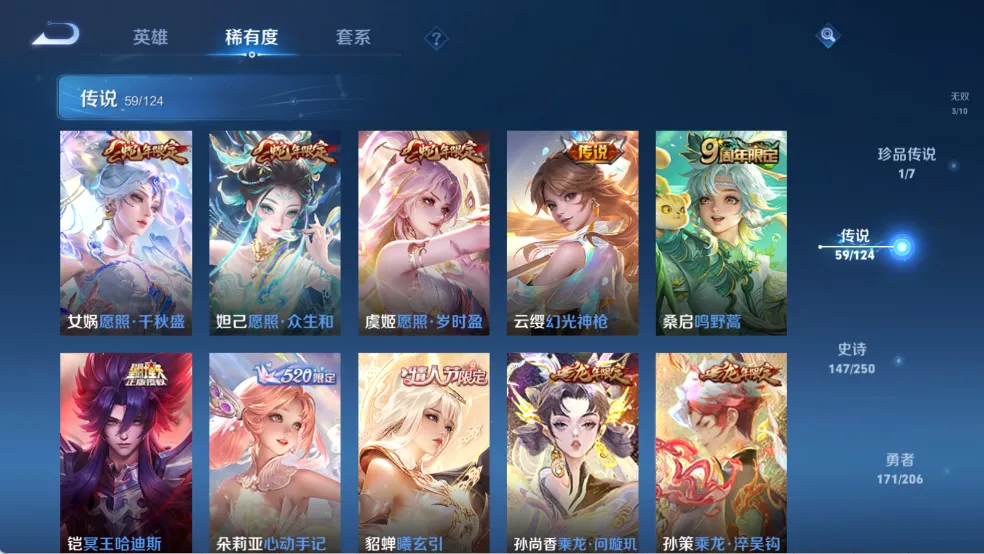 贵族等级V10,英雄数量124,典藏皮肤数13,皮肤数量477,