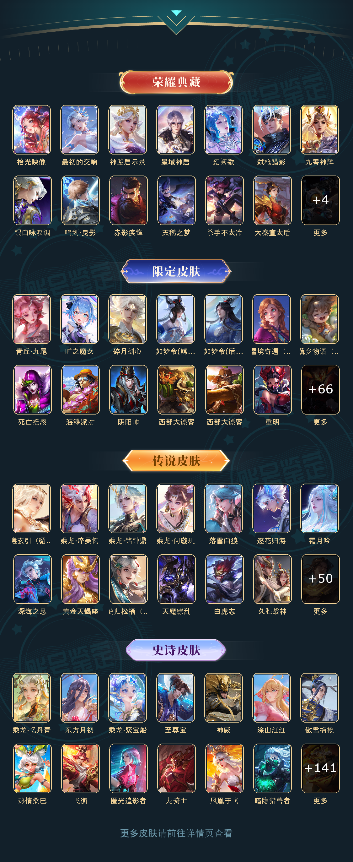 贵族等级V10,英雄数量124,典藏皮肤数18,皮肤数量491,纯白花嫁/天魔缭乱/至尊宝/真爱至上/圣诞老人/热情桑巴/梅西/青龙志/白虎志/朱雀志/久胜战神/飞衡/匿光追影者/鸣剑·曳影/星域神启/李逍遥/武圣/玉兔公主/补天/异界灵契/神威/启示之音/傲雪梅枪/时雨天司