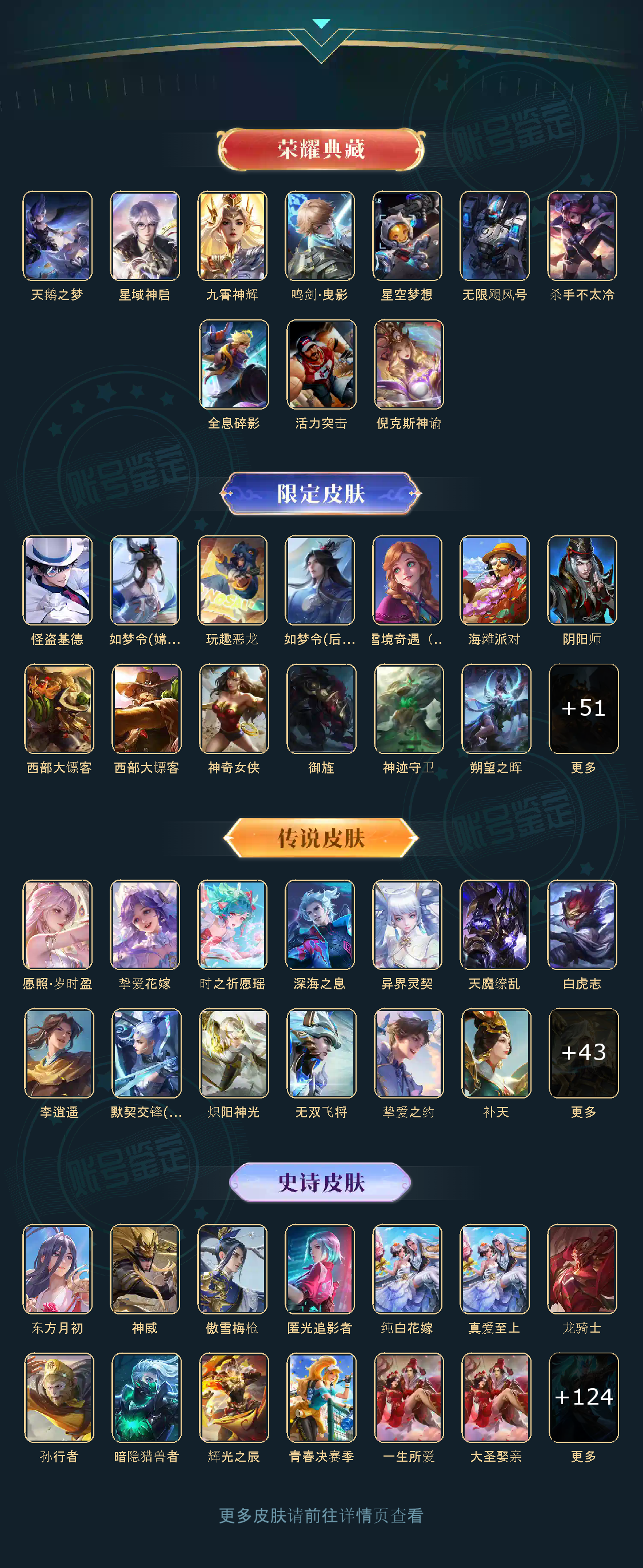 贵族等级V10,英雄数量125,典藏皮肤数10,皮肤数量402,天鹅之梦/杀手不太冷/星空梦想/无限飓风号/全息碎影/活力突击/倪克斯神谕/鸣剑·曳影/星域神启