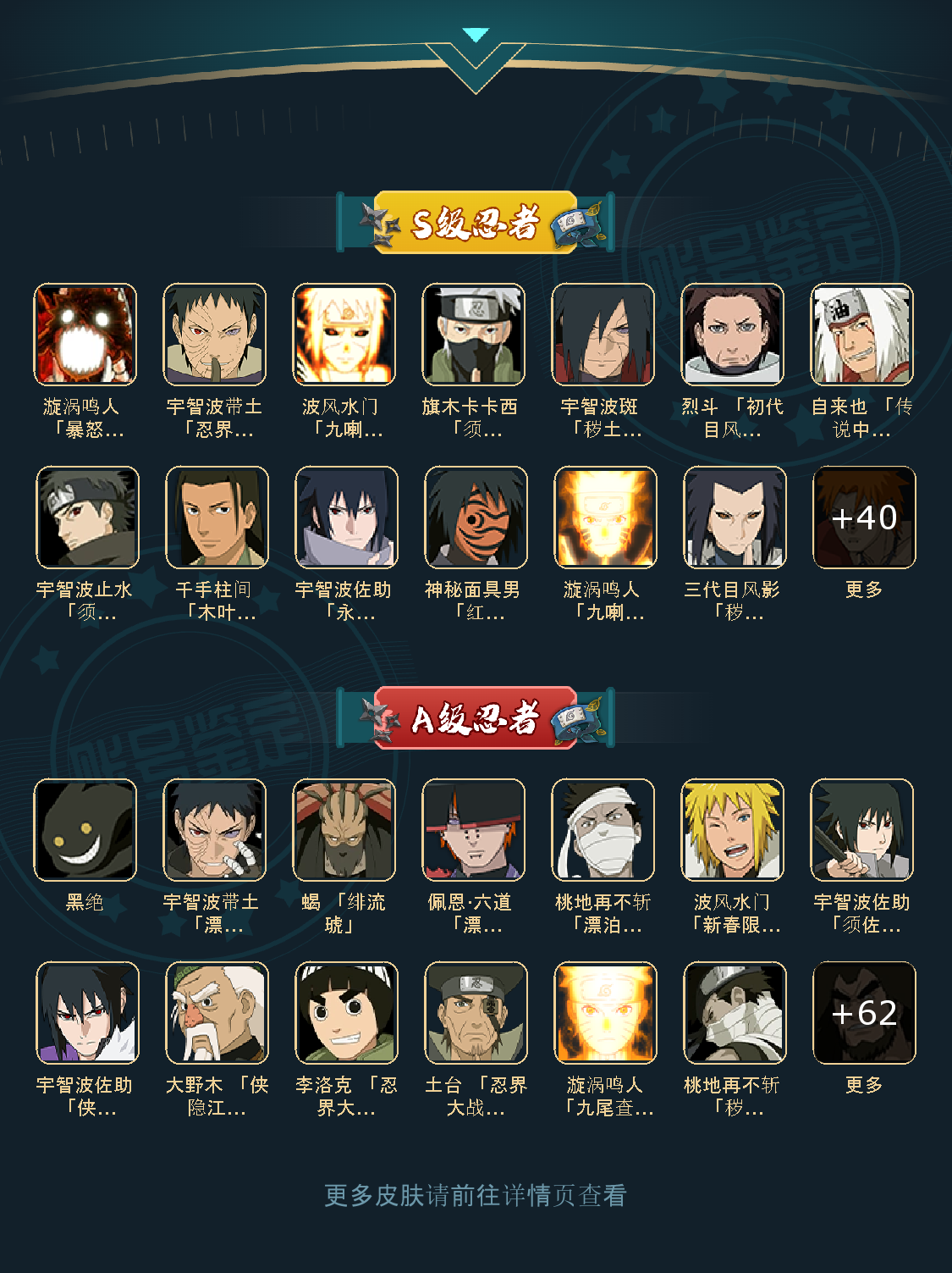 50S忍 木叶班✨秽土水门✨白面具✨三代猿飞日斩✨秽土鼬✨秽土斑✨自来也✨大蛇丸✨秽土长门✨仙人自来也✨仙人兜✨无✨二代千手扉间✨三代雷影艾✨秽土半藏✨天道佩恩✨百豪纲手✨千手柱间初代✨佩恩超天道超✨水门✨金角银角✨须佐鼬✨纲手✨秽土二代✨鬼灯幻月✨斑✨豪杰自来也✨秽土三代 喜欢的点个收藏ヾ^。^* 多多来个好评 小弟在这里祝大家玩得开心。✪ω✪ 登入不上的 看一下游戏是否更新到最新版本,退出自己的游戏账号,在一键登录。