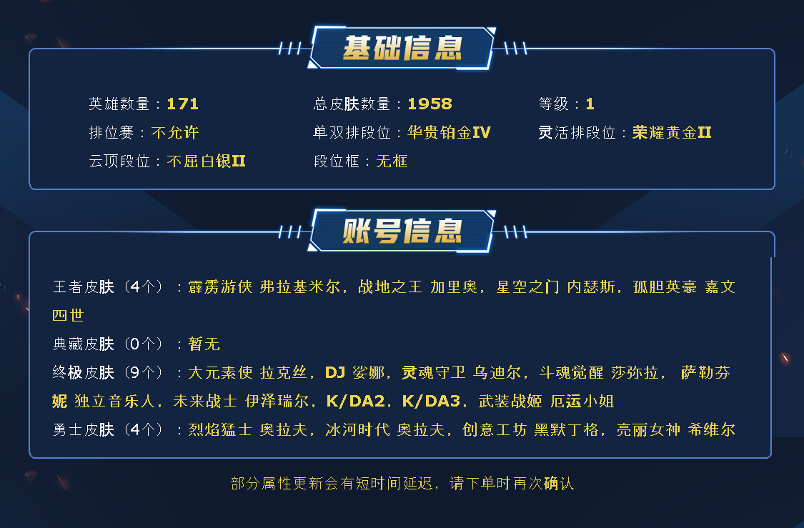出现异常多登录几次即可!!!电一艾欧尼亚丨1200原皮丨联盟不朽签名版卡莎阿狸丨圣天龙李青丨炽天使永恩丨冰原酒桶丨多传说多限定!!!云顶多小小英雄多棋盘!!喜欢记得收藏!租之前建议查一下段位是不是你要的,确保是你需要的再租哦。 请勿挂机送人头!!!很重要!!!发现挂机送人头锁单永久拉黑!!