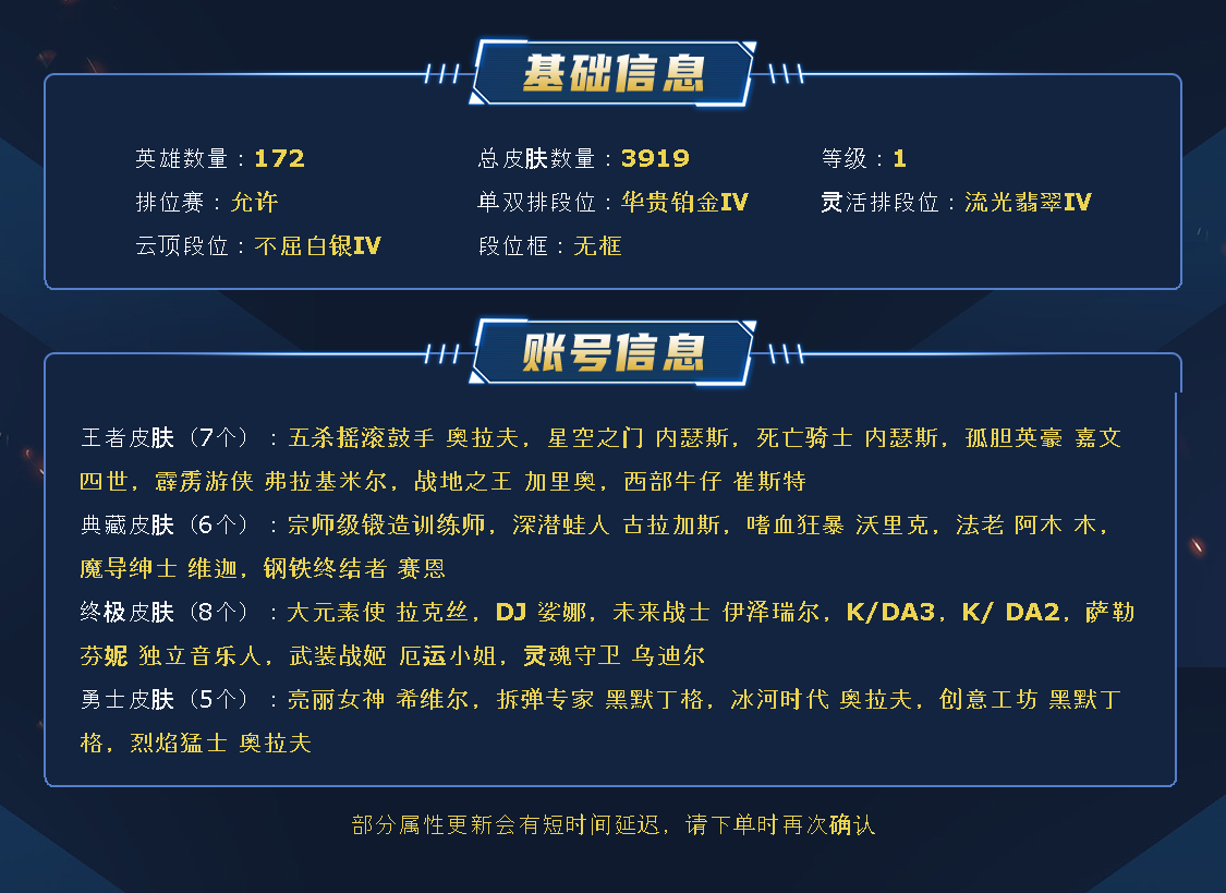 ~~喜欢记得收藏~~可排位~~3903皮全英雄丨1536原皮2367炫彩~~租之前尽量查一下游戏ID,确保段位是您需要的,避免浪费您的时间~~请勿挂机逃跑故意送人头,谢谢合作,谢谢~~