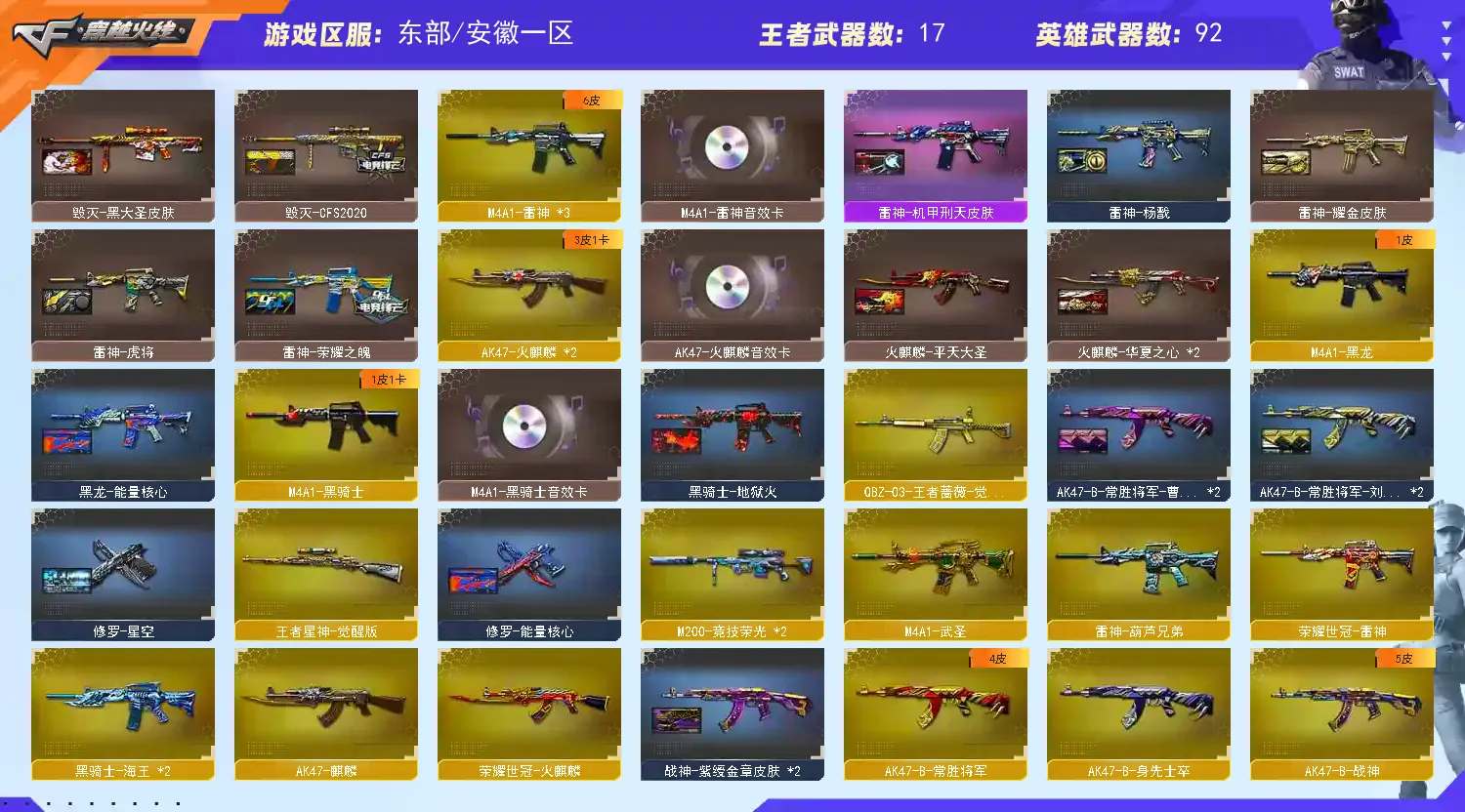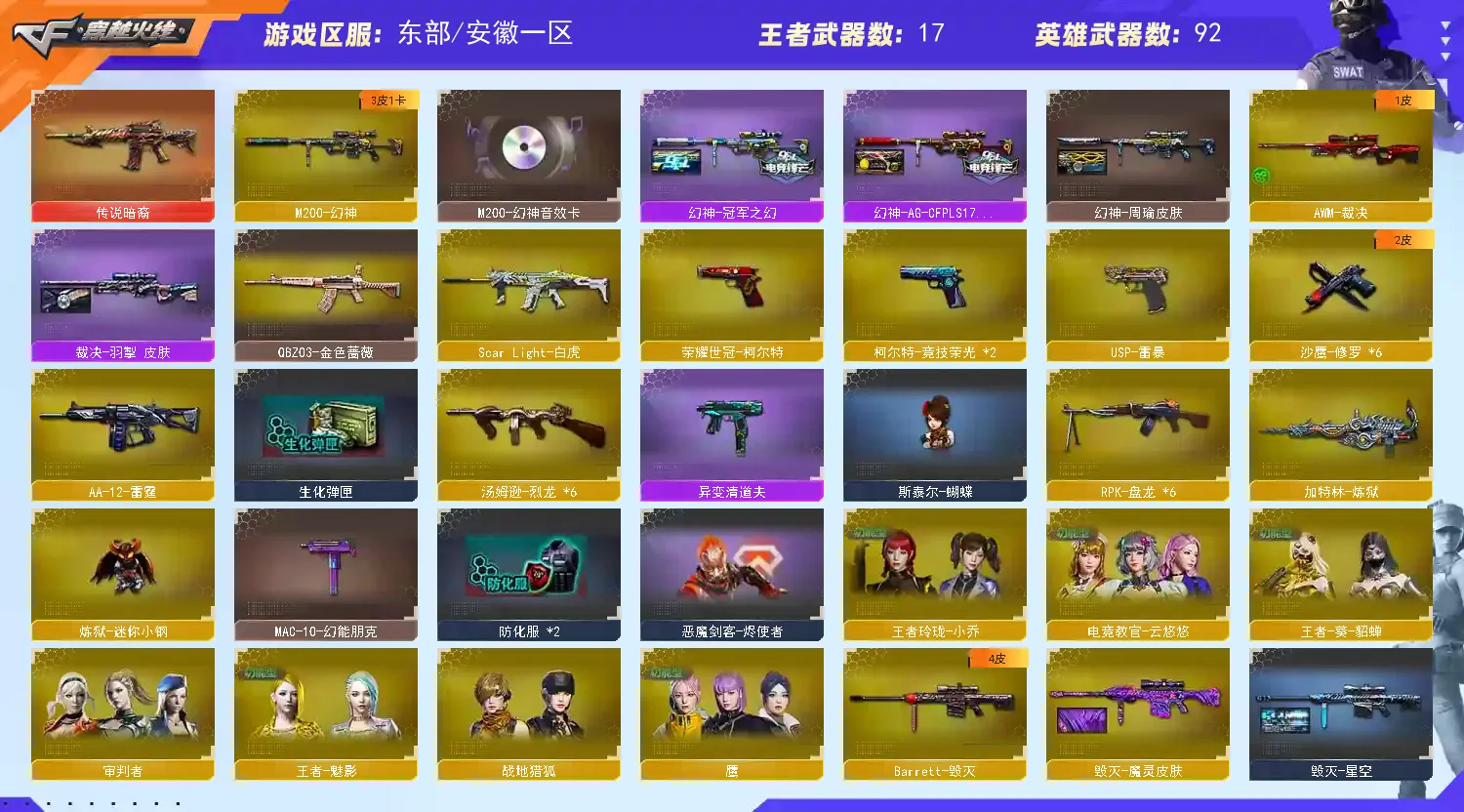 幻神三件套 蓝天白云名片 生化六盘+迷你小钢 六烈+蝴蝶】 【m200-幻神+音效卡+幻神-冠军之幻+幻神-ag17冠军+幻神-周瑜】 【竞技荣光套+四防云悠悠+usp雷暴】 【王者星神】 【传说暗裔】 【武圣套】 【白虎】 【qbz金色蔷薇】 【火麒麟+音效卡】 【麒麟】 【黑龙】 【雷神+音效卡+雷神-荣耀之魄】 【黑骑士+音效卡+白马银呛】 【毁灭】 【裁决】 【王者之心 王者之翼 王者之势】 【生化 6盘龙 炼狱 6烈龙 蝴蝶 迷你小钢】 【11手呛 修罗*6 usp雷暴】 【17近战 屠龙*4 龙啸*2 擎天 幻灵之锋*3 王者之锋 王者之啸*2 王者之击】 【手雷 竞技荣光*7】 【四防 王者葵貂蝉 王者魅影 王者玲珑小乔】 【炫彩背包 虎牙炫彩背包 xrock炫彩背包