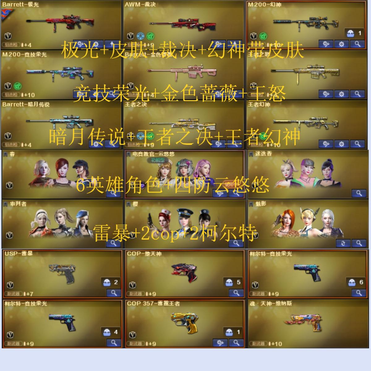 192V19王者11炫金可排位/M200-幻神/王者幻神觉醒/M200竞技荣光+柯尔特竞技荣光2把+擎天竞技荣光+2套竞技荣光雷+【四防】电竞教官-云悠悠/M4A1-青龙/HK417-朱雀/Scar Light-白虎/QBZ03-金色蔷薇/QBZ-03-王者蔷薇觉醒/雷暴套装+6套雷暴雷/堕天神套装+6套堕天神雷/7盘龙1炼狱6烈龙+异变清道夫+斯泰尔蝴蝶+死亡之眼/【四防】王者-瞳-闭月羞花/【四防】王者葵-惊若翩鸿/【四防】灵狐者-职业经理/Barrett-毁灭音效卡/M4A1-黑骑士音效卡/M4A1-雷神音效卡/AK47-火麒麟音效卡/黑骑士-白马银枪/雷神-机甲刑天皮肤/白虎-热带奇洋皮肤/雷神-宇航兔/火麒麟-百城/毁灭-星空/修罗-星空/火麒麟-雷神/修罗-CFS2018/毁灭-CFS2018/毁灭-AG-CFPLS15冠军/雷神-杨戬/毁灭-黑大圣皮肤/雷神-冠军之魄/火麒麟-冠军之心/雷神-荣耀之魄/毁灭-荣耀之怒/屠龙-荣耀之锋/千变-孔明/火麒麟-CFSTAR/天龙-CFSTAR/修罗-CFSTAR/AWM-天龙-传奇白鲨/M4A1-雷神-精英刀锋/火麒麟-绝迹/金色小号/机甲撕裂者3/巨龙咆哮3/神圣爆裂者-末日3/试炼破坏者3/阐释者3/王者之城/王者之心觉醒/王者火魄觉醒/王者之幻/王者之戮/王者之魄觉醒/王者之势觉醒/王者之武觉醒/王者之决觉醒/王者之怒觉醒/COP357-雷霆王者觉醒/王者之锋觉醒/王者之啸觉醒/炫金武士/炫金超新星/炫金雷神/炫金骑士/炫金毁灭/春/樱/魅影/审判者/迷迭香/王者樱-热浪之夏/新海豹突击队/烟雾保护头盔