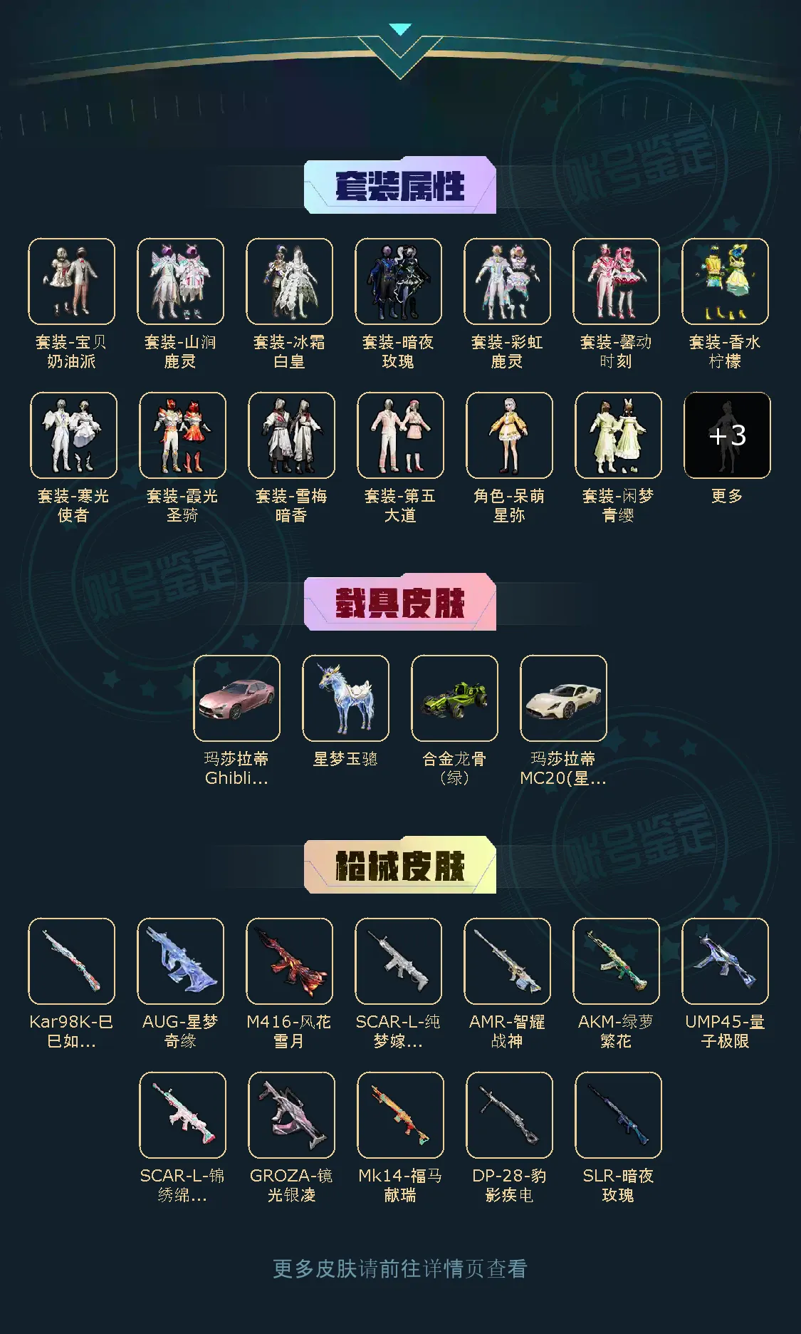 【粉色枪皮】AKM-绿萝繁花/SCAR-L-锦绣绵绵/SCAR-L-纯梦嫁纱/M416-风花雪月/GROZA-镜光银凌/AUG-星梦奇缘/Kar98K-巳巳如意/AMR-智耀战神/SLR-暗夜玫瑰/UMP45-量子极限