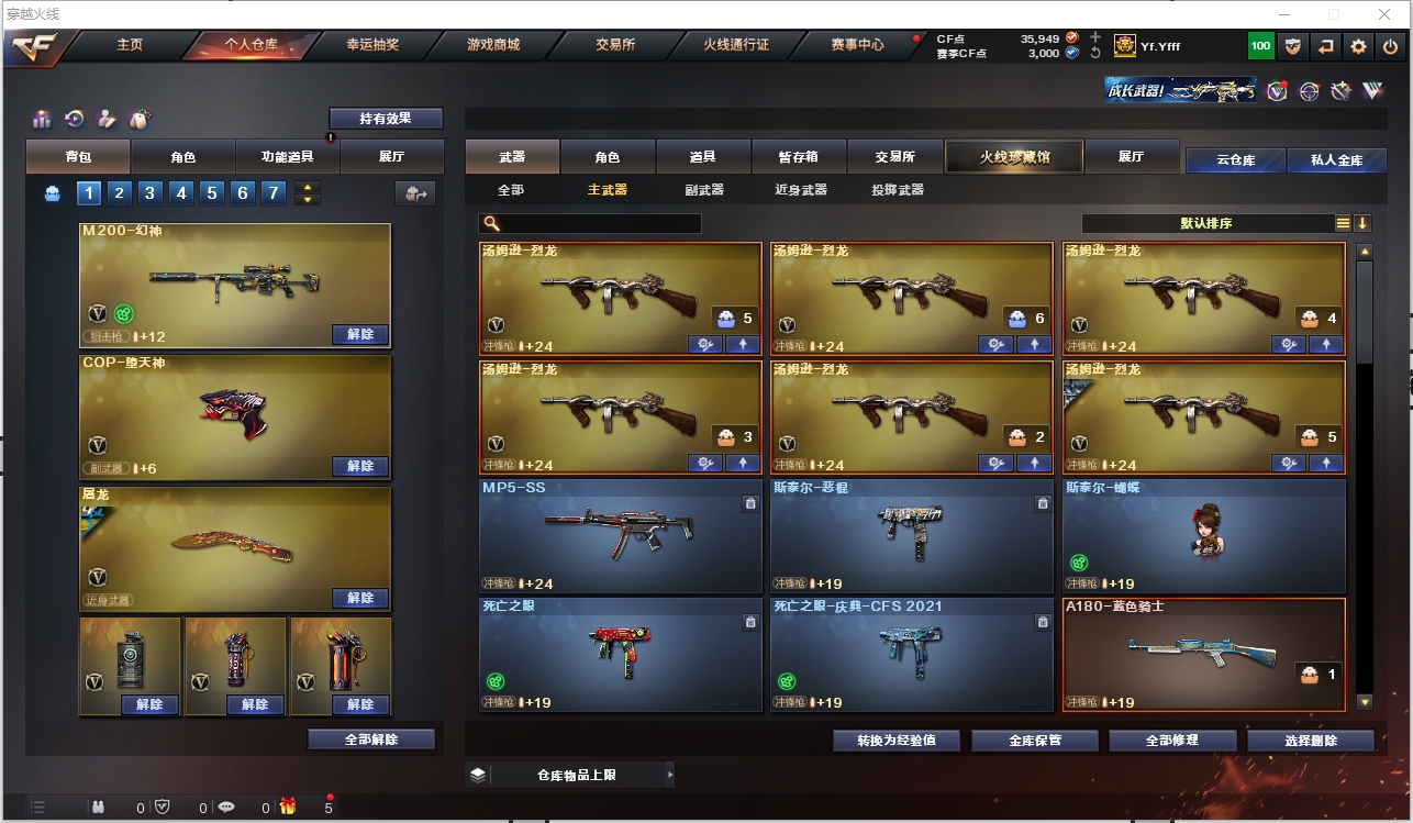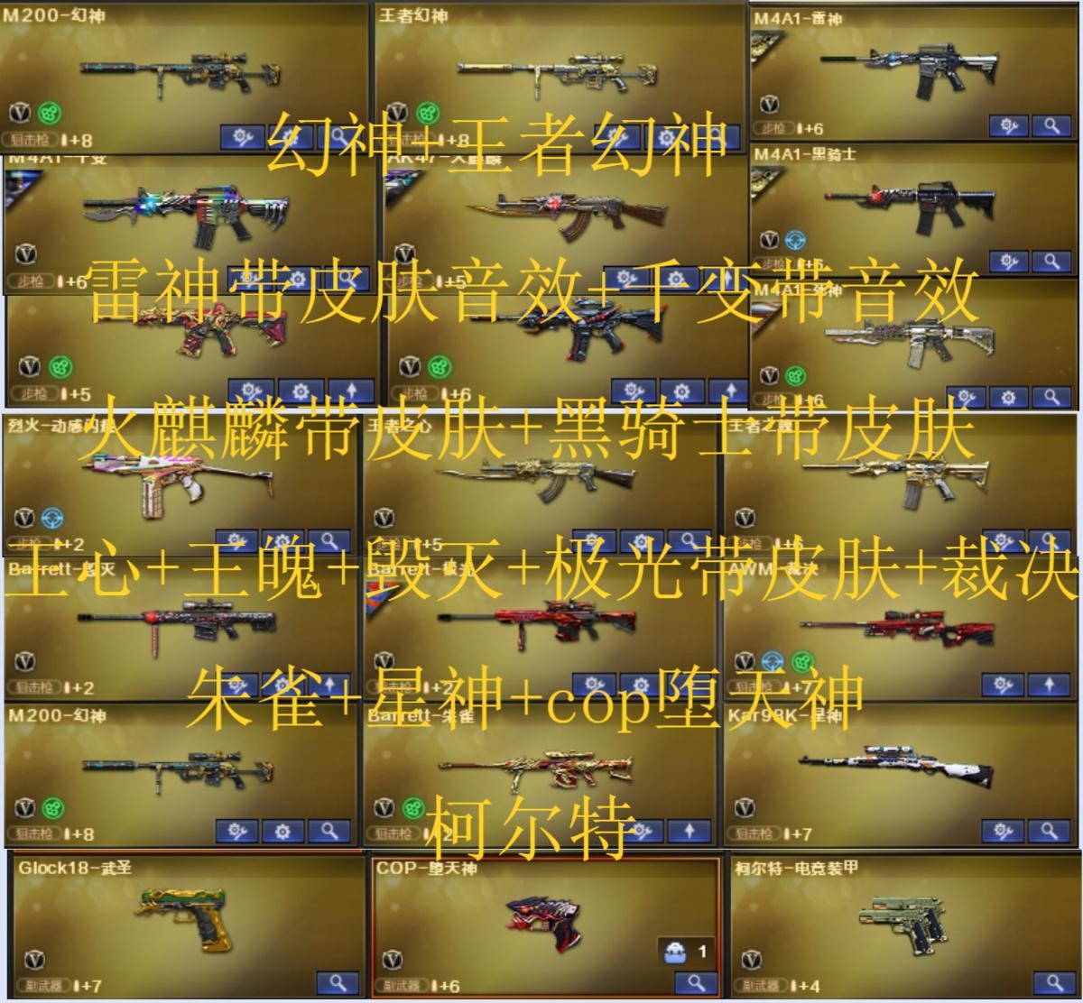 142V20王者8炫金可排位M200-幻神/王者幻神/Kar98K-星神/Barrett-朱雀/Barrett-金色蔷薇/HK417-朱雀/M4A1-夜魔+马来剑-夜魔+1套夜魔雷/QBZ03-金色蔷薇/白虎-电玩蓝兔/柯尔特-电竞装甲+1套电竞装甲雷/COP357-堕天神+龙啸-堕天神+2麒麟刺-堕天神+5套堕天神雷/5盘龙6炼狱6烈龙+死亡之眼-庆典-CFS2021+斯泰尔-蝴蝶/【四防】王者-葵-貂蝉/【四防】王者-春/【四防】王者-瞳-闭月羞花/AK47-火麒麟音效卡/M4A1-雷神音效卡/Barrett-极光音效卡/Bareett-毁灭音效卡/M4A1-黑龙音效卡/AWM-裁决音效卡/M4A1-黑骑士音效卡/雷神-机甲刑天皮肤/黑骑士-摸金校尉/雷神-宇航兔皮肤/火麒麟-百城/黑龙-冠军之武/火麒麟-雷神/毁灭-星空/雷神-星空/毁灭-墨兰皮肤/白虎-电玩粉兔/修罗-CFS2018/火麒麟-CFS2018/毁灭-CFS2018/毁灭耀金皮肤/毁灭-BEAN-2020MVP/毁灭-神秘黑洞皮肤/雷神-传奇N9/AK47-火麒麟-传奇EVEN/毁灭-AG-CFP[LS15冠军/雷神-白鲨-CFPLS14冠军/黑龙-墨子皮肤/雷神-虎将/AK47-黑武士-361/火麒麟-华夏之心/黑武士-典韦皮肤/屠龙-荣耀之锋/AWM-天龙-传奇70KG/火麒麟-AG战队皮肤/雷神-荣耀之魄/火麒麟-CFSTAR/王者之心觉醒/王者之翼/王者冰魄觉醒/王者之戮觉醒/王者之魄觉醒/王者之势/王者之决觉醒/王者之力/王者之怒/王者之魂觉醒/王者之刺/王者之啸觉醒/炫金火麒麟/炫金黑龙/炫金雷神/炫金骑士/炫金毁灭/M4A1-雷神-精英刀锋/火麒麟-绝迹/火麒麟-灵狐/COP-白鲨/毁灭征服者-超越Max/机甲撕裂者3/激光毁灭者3白马银枪/末日审判者3/KAC-圣炎切割者3/深渊巨龙咆哮3/神圣爆裂者-末日3/阐释者3/惩戒者3/零/迷迭香/乔伊教练/王者-零/王者玲珑/炫/魅影/烟雾保护头盔+闪光护目镜/炫彩背包/超级背包3-7+扩展背包/永久防弹衣+永久防弹头盔+永久C4工具钳