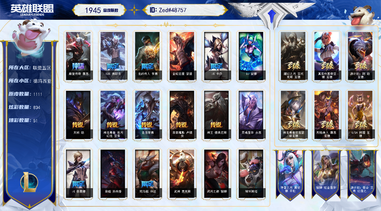 【联盟五区】1943皮丨73神话丨3氪金皮丨圣堂腕豪丨西部炽天使永恩丨灭世天煞劫丨兔年刀妹丨新龙虾