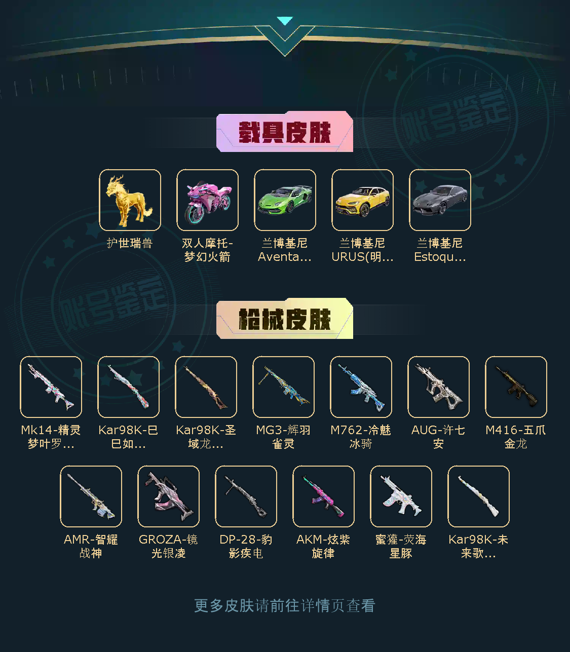 【粉色枪皮】M416-五爪金龙/AKM-炫紫旋律/GROZA-镜光银凌/AUG-许七安/M762-冷魅冰骑/蜜獾-荧海星豚/Kar98K-圣域龙灵/Kar98K-未来歌姬/Kar98K-巳巳如意/AMR-智耀战神/Mk14-精灵梦叶罗丽/MG3-辉羽雀灵