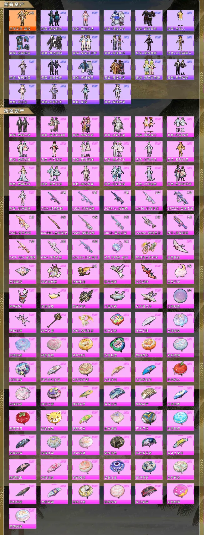 【稀有资产】圣域龙灵-瑞拉[2级]/套装-暗夜魅影/套装-粉红小猪/套装-浪漫天命/套装-暗影哥特/套装-龟仙人/套装-迅捷狂鲨/套装-胖达团团/套装-兔兔白日梦/套装-荒原牛仔/角色-摩登魅猫/角色-六号稻草人/角色-琉璃花蕾/套装-墨青刃影/套装-缤纷假日/套装-青涩年华/套装-萌萌史莱姆/套装-圣穹绘梦/角色-灵公主/角色-时希公主/角色-乐音/角色-鲛海歌灵