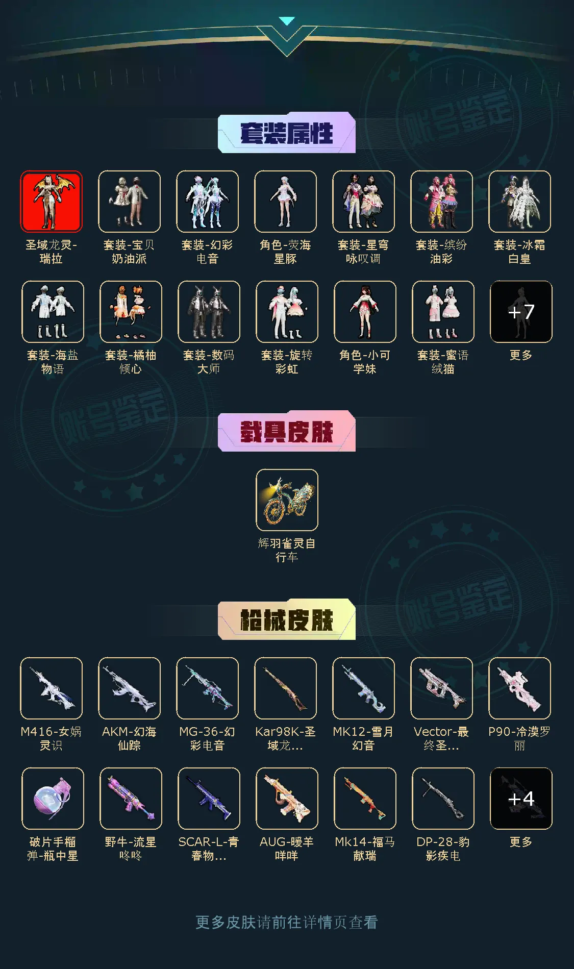 【粉色枪皮】AKM-炫紫旋律/AKM-幻海仙踪/SCAR-L-青春物语/M416-女娲灵识/GROZA-圣辉之星/AUG-暖羊咩咩/Kar98K-圣域龙灵/AMR-智耀战神/MK12-雪月幻音/Vector-最终圣卫者/野牛-流星咚咚/AKS-74U-星穹咏叹调/P90-冷漠罗丽/MG-36-幻彩电音/破片手榴弹-瓶中星球