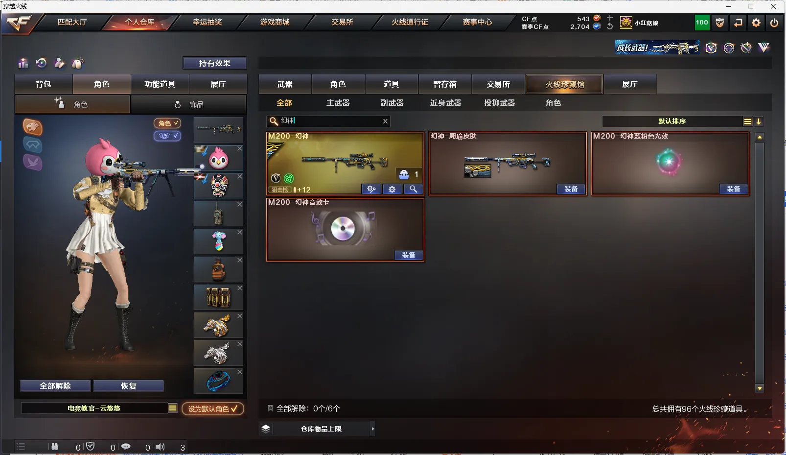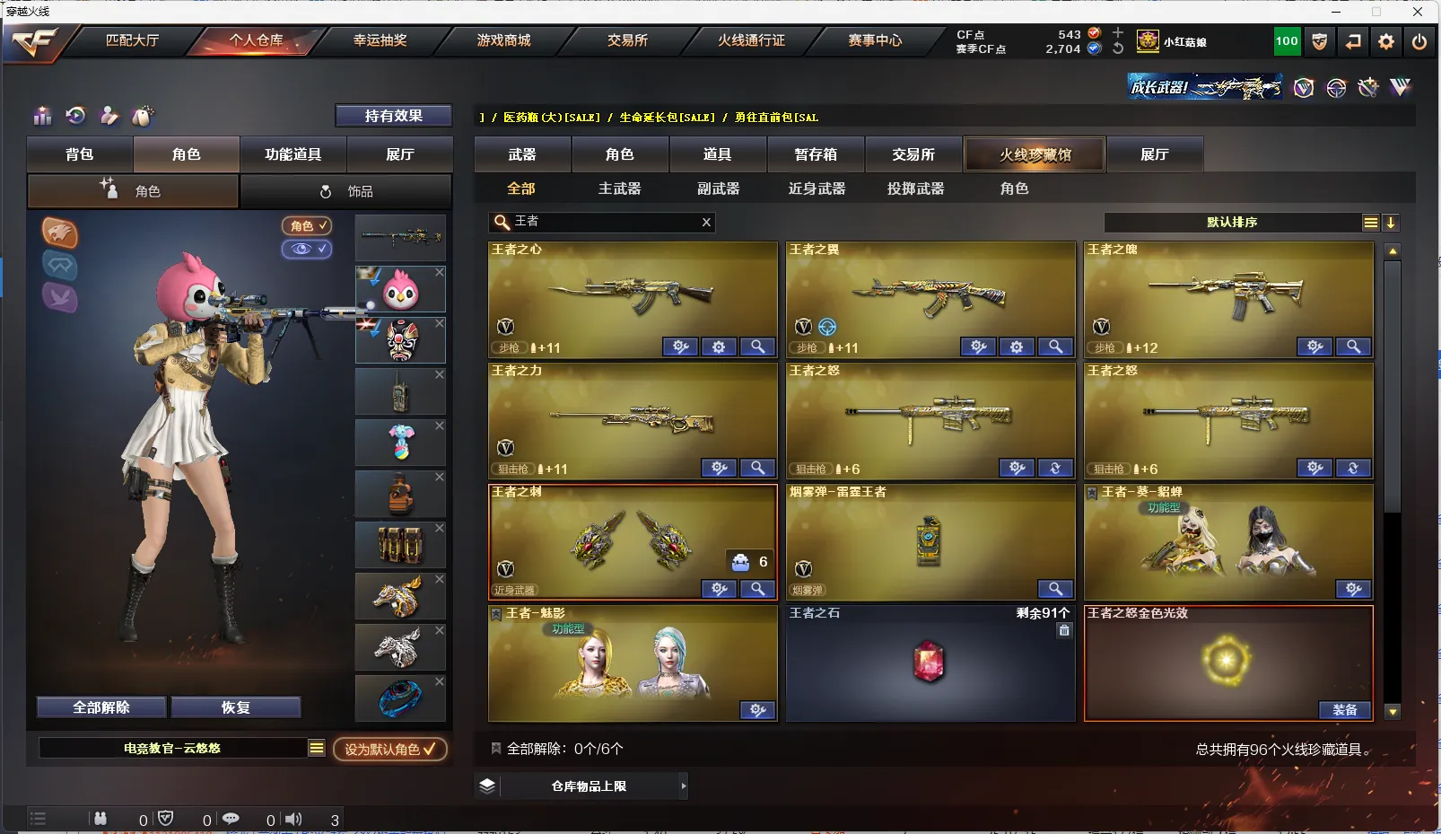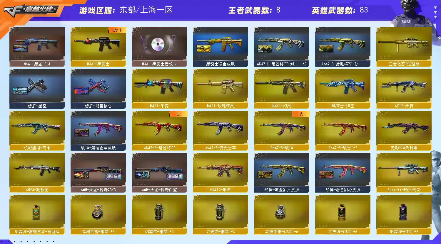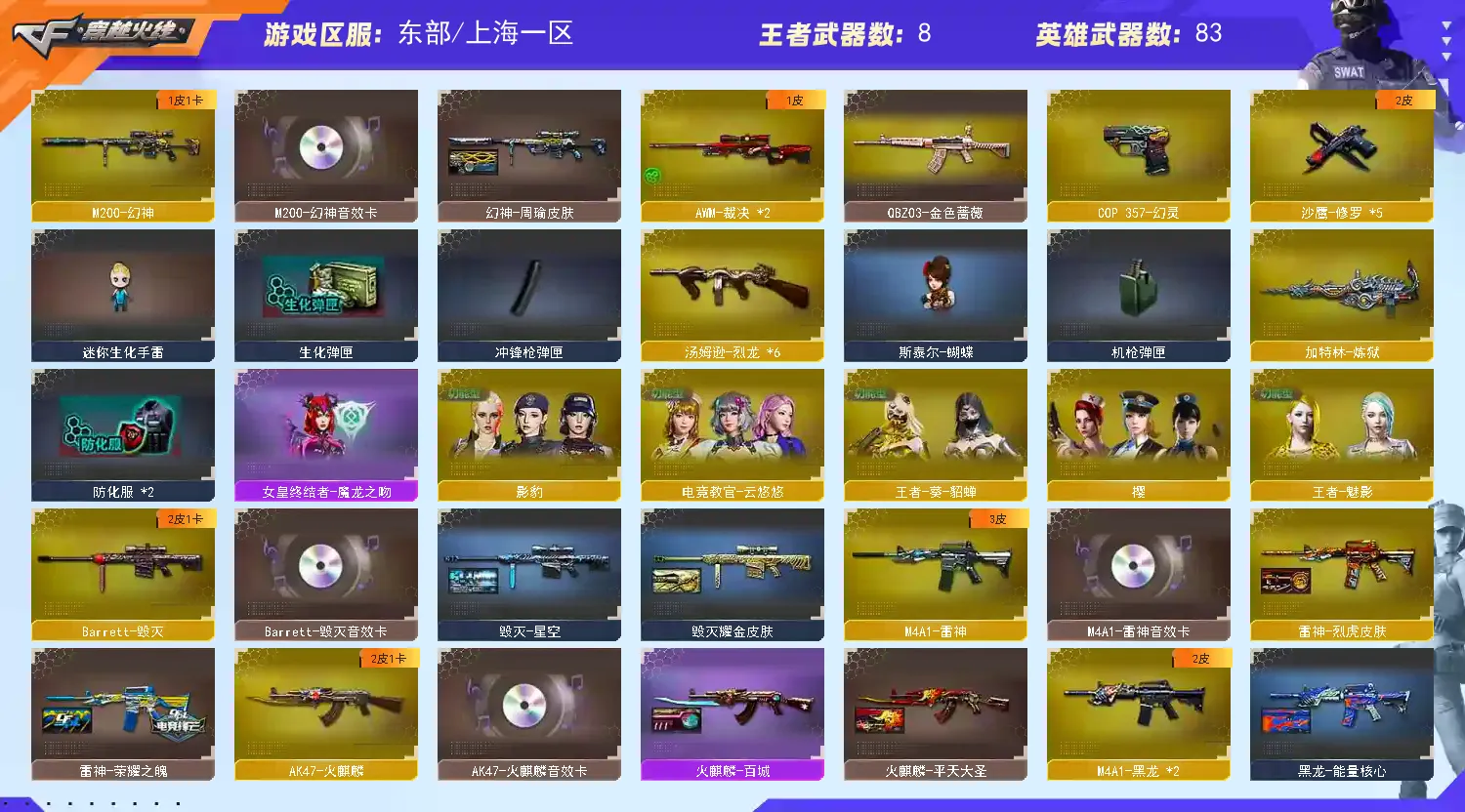 上海一区-85V-10王者-1炫金 【热门武器】:QBZ03-金色蔷薇,HK417-朱雀,M200-幻神,牛牛-AK47,M4A1-黑骑士,汤姆逊-烈龙*6,加特林-炼狱,斯泰尔-蝴蝶,雷神-小红,COP 357-幻灵,沙鹰-修罗*5,金刚伞 【王者炫金武器】:炫金骑士,王者之怒*2 【音效卡】:M200-幻神音效卡,AK47-火麒麟音效卡,M4A1-雷神音效卡,M4A1-黑骑士音效卡,Barrett-毁灭音效卡 【稀有皮肤】:幻神-周瑜皮肤,雷神-荣耀之魄,雷神-赛博朋克,火麒麟-平天大圣,火麒麟-百城,黑骑士-摸金校尉,M4A1-黑龙-361,毁灭耀金皮肤,毁灭-星空,AWM-天龙-传奇70KG,AWM-天龙-传奇白鲨,无影耀金皮肤,AWM-CFS 2020*2,修罗-星空 【角色】:王者-葵-貂蝉,王者-魅影,灵狐者-职业经理,电竞教官-云悠悠,樱,蜀雪,影豹,铁骑荣耀,职业选手 【人偶武器】:雷神-小红,斯泰尔-蝴蝶,巴雷特-零-水下丽影,牛牛-AK47,迷你深渊冰龙,迷你牛牛,迷你生化手雷,闪光弹-小乔,闪光弹-貂蝉,高爆手雷-大乔 【暴走生化】:斯泰尔-蝴蝶,超级对讲机 【挑战大师】:神圣爆裂者III,KAC-圣炎切割者III,激光毁灭者III 【英雄级武器】:高爆手雷-竞技荣光,烟雾弹-竞技荣光,闪光弹-竞技荣光,M4A1-幻灵,COP 357-幻灵,幻灵之锋,马来剑-夜魔,斩神刀-雷暴,QBZ03-金色蔷薇,HK417-朱雀,无影-神兵利器,M4A1-雷神,M4A1-黑龙*2,M4A1-玫瑰精灵,M4A1-黑骑士,加特林-炼狱,汤姆逊-烈龙*6,AK47-火麒麟,AK12-天启,AN94-超新星,AWM-天龙,Barrett-毁灭,AWM-裁决*2,M200-幻神,M4A1-千变,黑骑士-海王,AK47-B-战神,AK47-B-常胜将军,沙鹰-修罗*5,麒麟刺*2,擎天,龙啸,屠龙*3 【特殊枪械】:蝴蝶斯泰尔+6烈龙,0白虎,1黑骑士,6烈龙,0盘龙,1炼狱,1蝴蝶斯泰尔