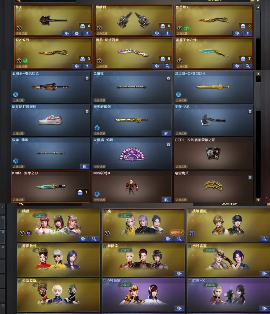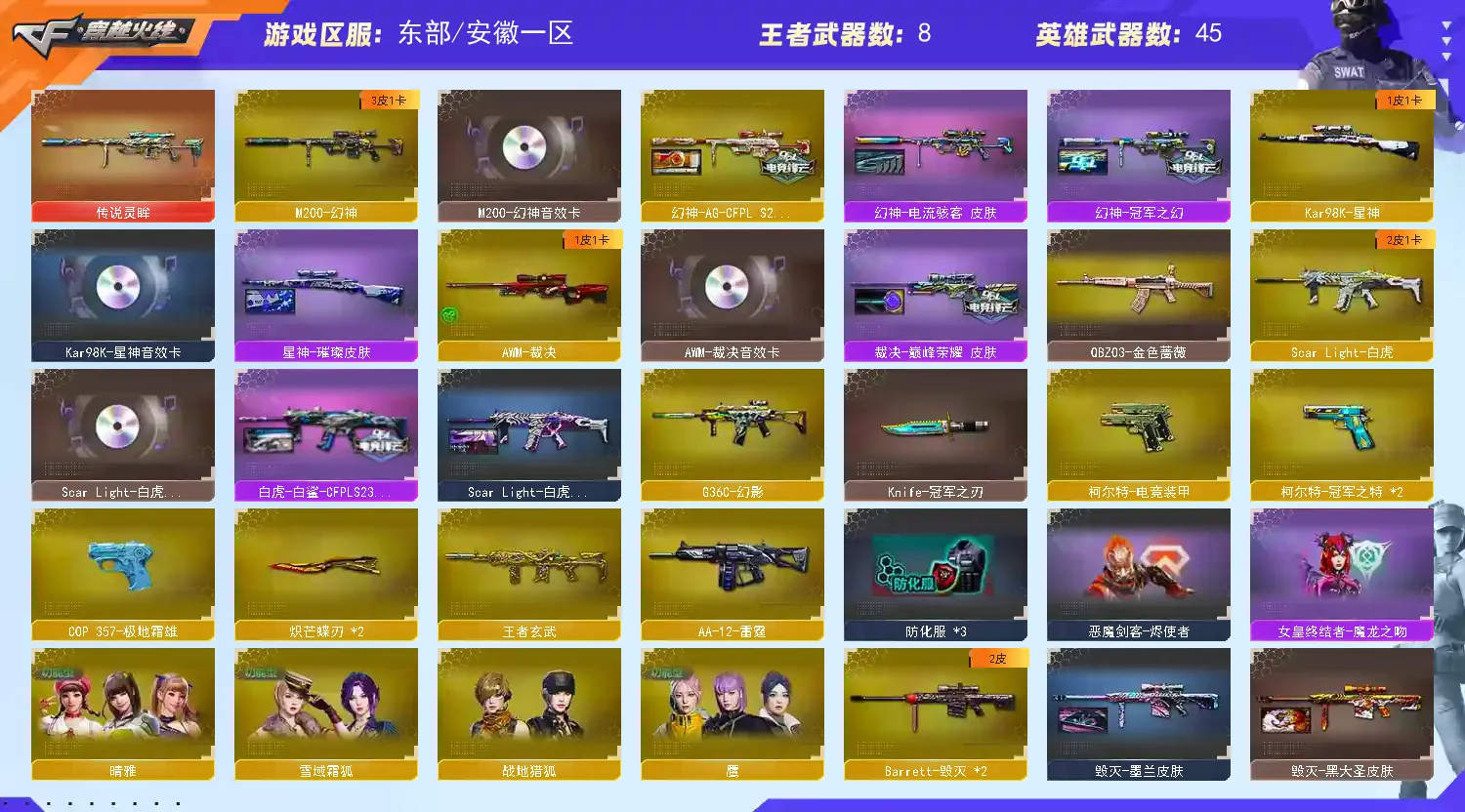 G36幻影传说灵眸。幻神③皮带卡。白虎②皮带卡。星神璀璨带卡。②冠特②蝴蝶刀+冠刃。鹰晴雅。裁决巅峰