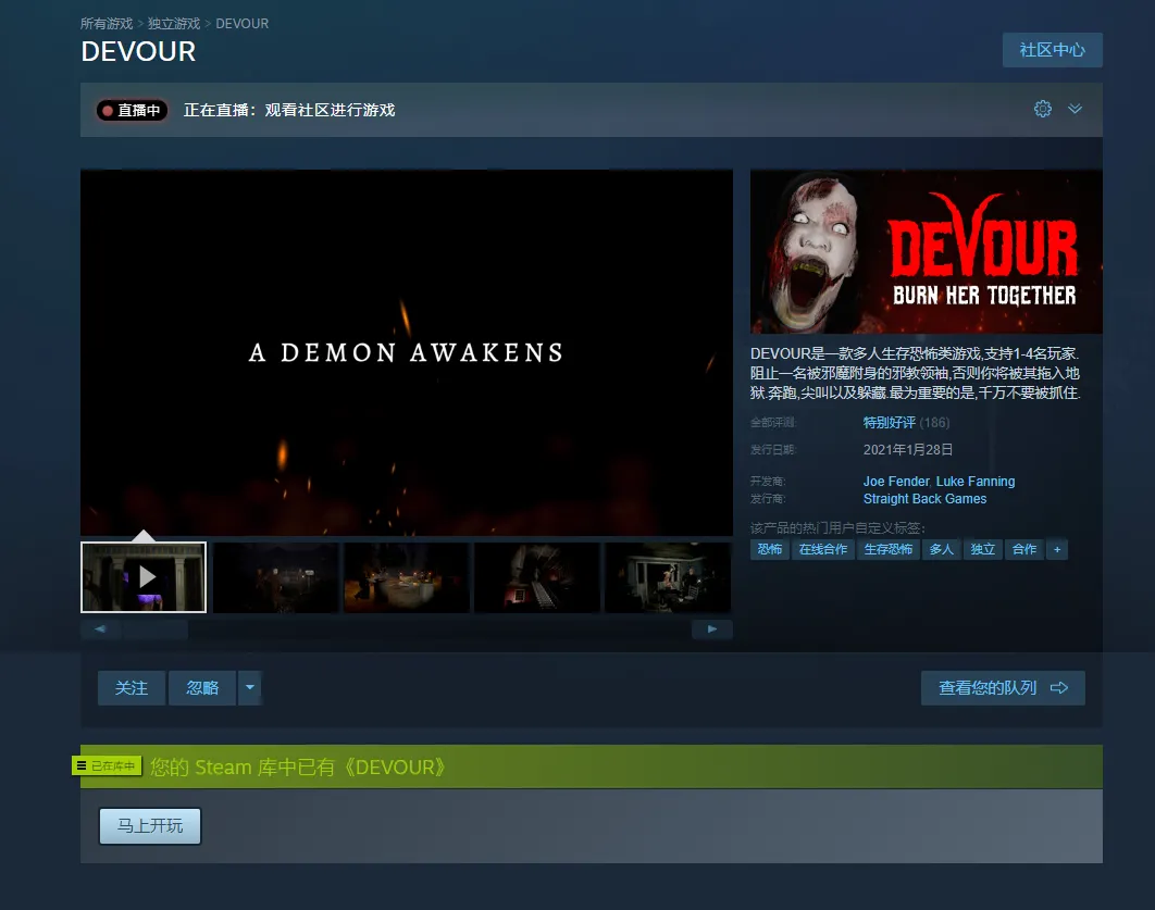 DEVOUR是一款多人生存恐怖游戏,支持1-4名玩家.快去制止那些被附身的邪教徒,不然地狱将是最后的归宿.奔跑吧,尖叫吧,快快躲起来吧.不过可记住了,千万不要让我抓到你哦...