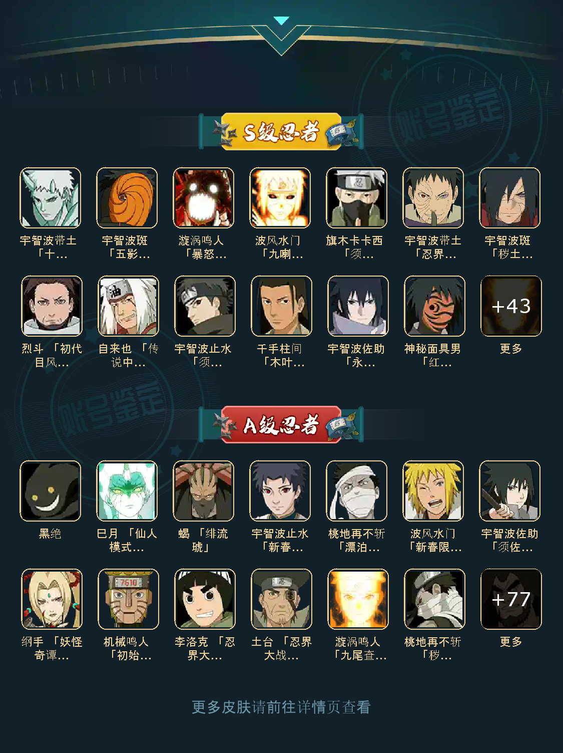 49S 83A 379忍者 宇智波止水「新春限定」/桃地再不斩「漂泊武士」/蝎 「绯流琥」/波风水门「新春限定」/神秘面具男 「红夜之刃」/宇智波斑 「秽土转生·解」/自来也 「传说中的三忍」/波风水门「秽土转生」/千手柱间 「木叶创立」/宇智波止水 「须佐能乎」/漩涡鸣人 「九喇嘛连结」/大筒木舍人 「最终章」/宇智波斑「白面具」/艾 「忍界大战」/宇智波带土「忍界大战」/宇智波佐助 「永恒万花筒」/大筒木桃式/佩恩·天道「超」/旗木卡卡西 「须佐能乎」