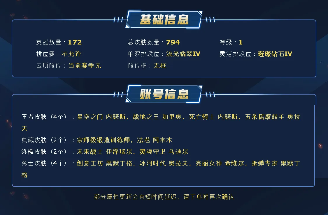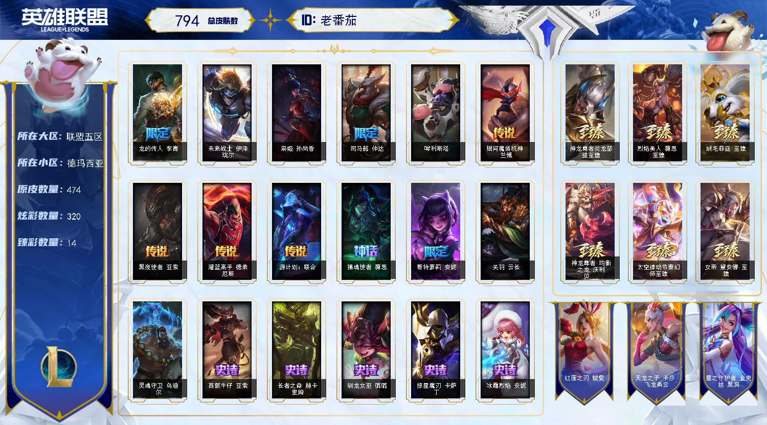 【全英雄可排位460原皮肤】至臻璐璐、至臻卡莎、至臻瑟提、至臻薇恩、至臻塞拉斯、至臻EZ、水晶圣骑蕾欧娜、摄魂薇恩、海克斯卡萨丁、海克斯鳄鱼、海克斯炸弹人、海克斯波比、海克斯玛尔扎哈、龙瞎、蛇年阿木木、电玩女枪、电玩锐雯、龙年猴子、羊年金克丝、司马懿、花木兰、猴年女警、星守阿卡丽、星守卡莎、女帝卡特琳娜、万圣节剑姬、万圣节赛娜、征服者卡尔玛、EDG男枪、至高天凯尔、墨影之灵奥瑞利安索尔、山海绘卷塔姆、灵魂莲华诺手、灵能莲华寡妇、魔域梦魇德莱文、西部卡特琳娜、焰执事布兰德、星守艾克、魅惑之月阿狸、光明哨兵派克、源计划赛娜、战斗学院日女、太空律动拉克丝、国王佛耶戈、春晖神女奇亚娜、女帝皎月、灵能特工慎、灵能特工莎弥拉、灵魂莲华薇恩、人马星神、猎户星神韦鲁斯、龙族卫士、灵魂守卫、未来战士EZ、万圣节艾克、电玩人马、哥特萝莉、克格汪、送披萨的小姐姐、万圣节卡特、情人节琴女、养蜂人、暗星女王拉克丝、暗星尊烬、黑夜奶妈、黑夜亚索、黎明锐雯、星守洛、星守霞、星守金克丝、源计划派克、源计划寒冰、真实伤害艾克、福牛守护者佛耶戈、古神艾翁、关羽、雷喵喵尔、黎明豹女、千纸凤凰、未来战士锐雯、西部人马、孙尚香、小恶魔小炮、小蜜蜂提莫、小蜜蜂大嘴、小蜜蜂玛尔扎哈、小蜜蜂悠米、腥红之月易、永恒之森霞、玉剑娜美、玉剑莫甘娜、玉剑锐雯、玉剑剑圣、源计划阿卡丽、源计划烬、源计划刀妹、真实伤害阿卡丽
